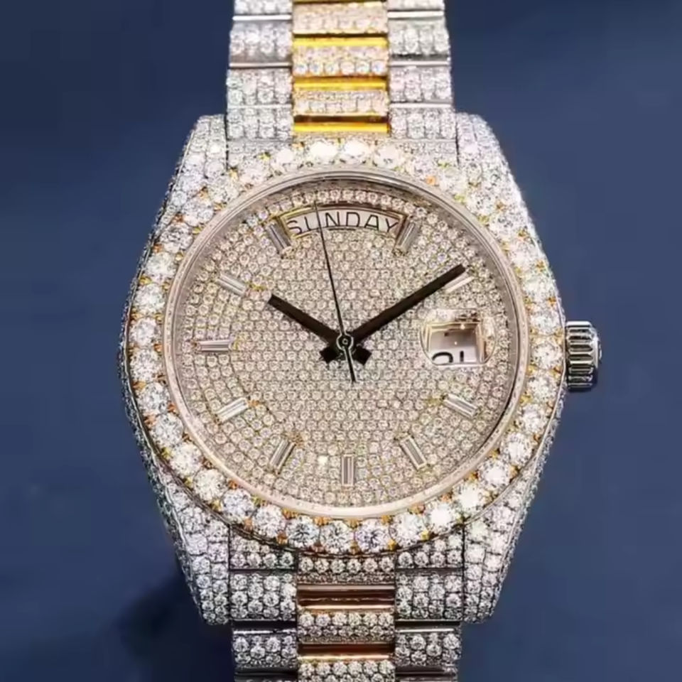 นาฬิกาข้อมือระยิบระยับสไตล์ฮิปฮอปตามสั่ง VVS เพชร Moissanite กรอบกลมประดับด้วยเม็ดสแตนเลส