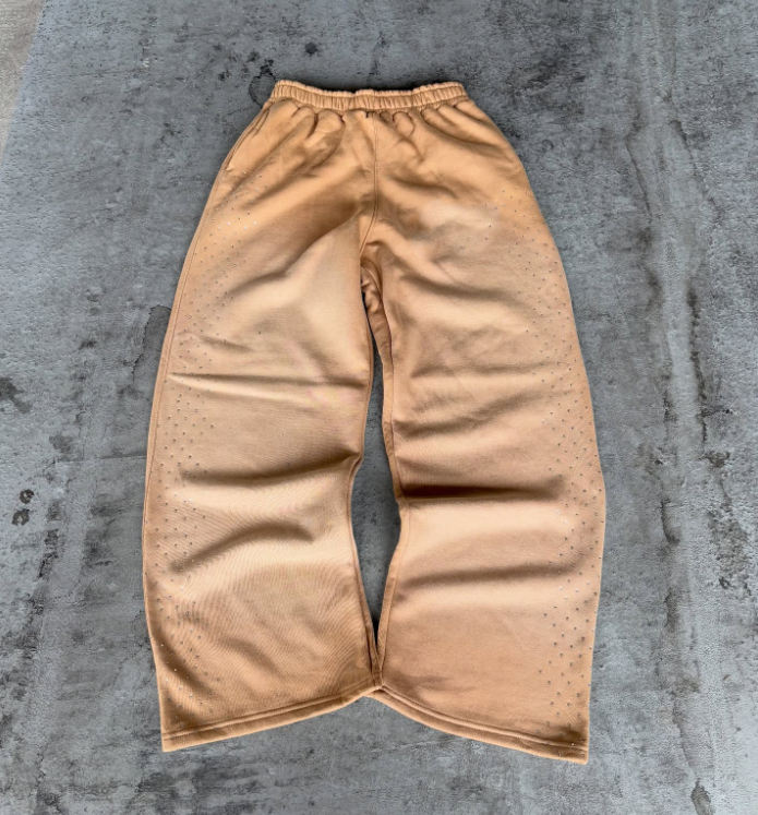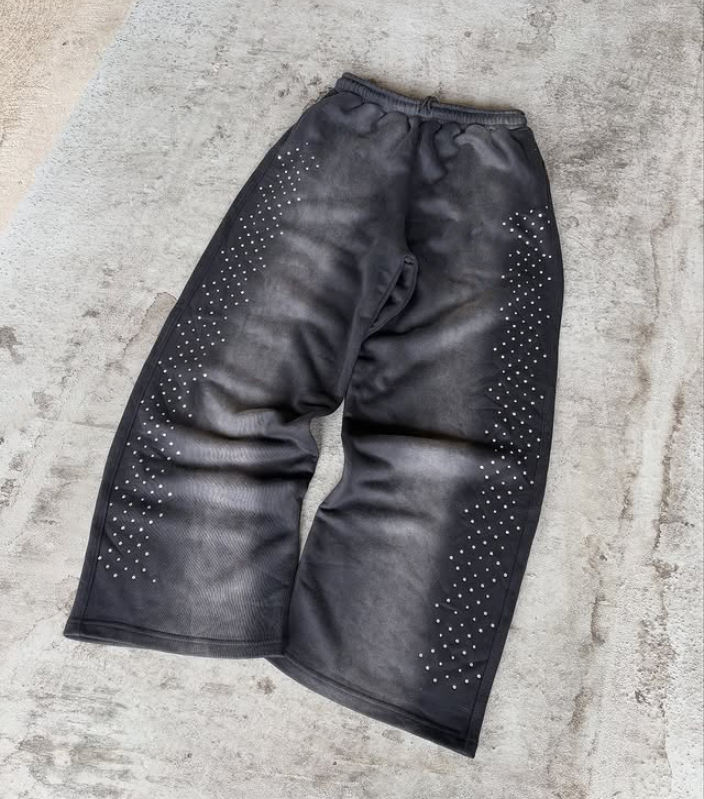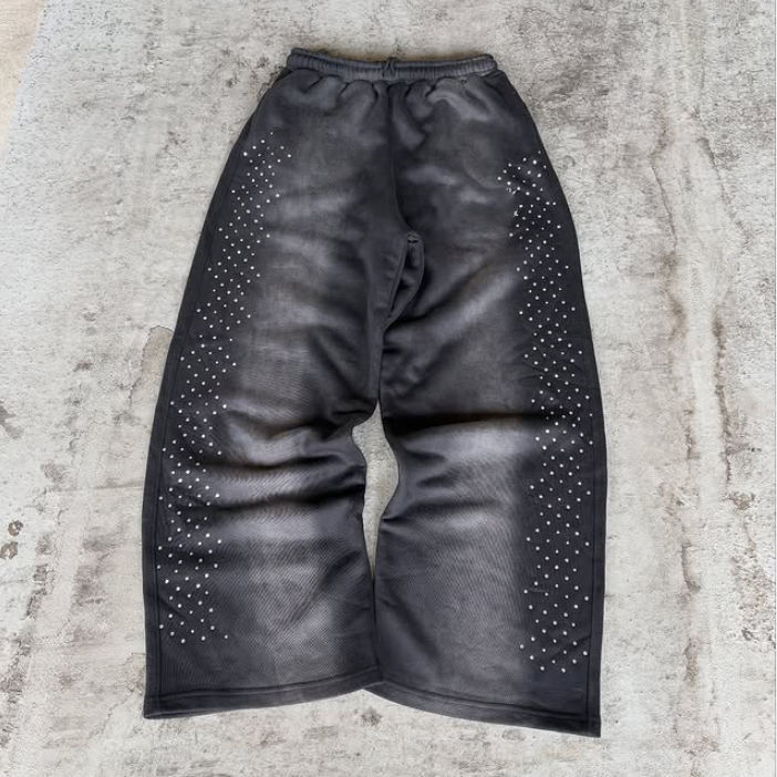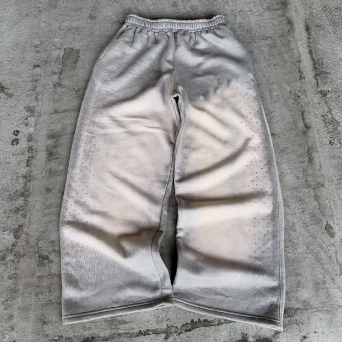 กางเกงจ็อกเกอร์ฮิปฮอปผู้ชายผ้าเฟรนช์เทอร์รี่ฟอกสีซีดแบบโอเวอร์ไซส์ทรงหลวมขาบานประดับคริสตัล
