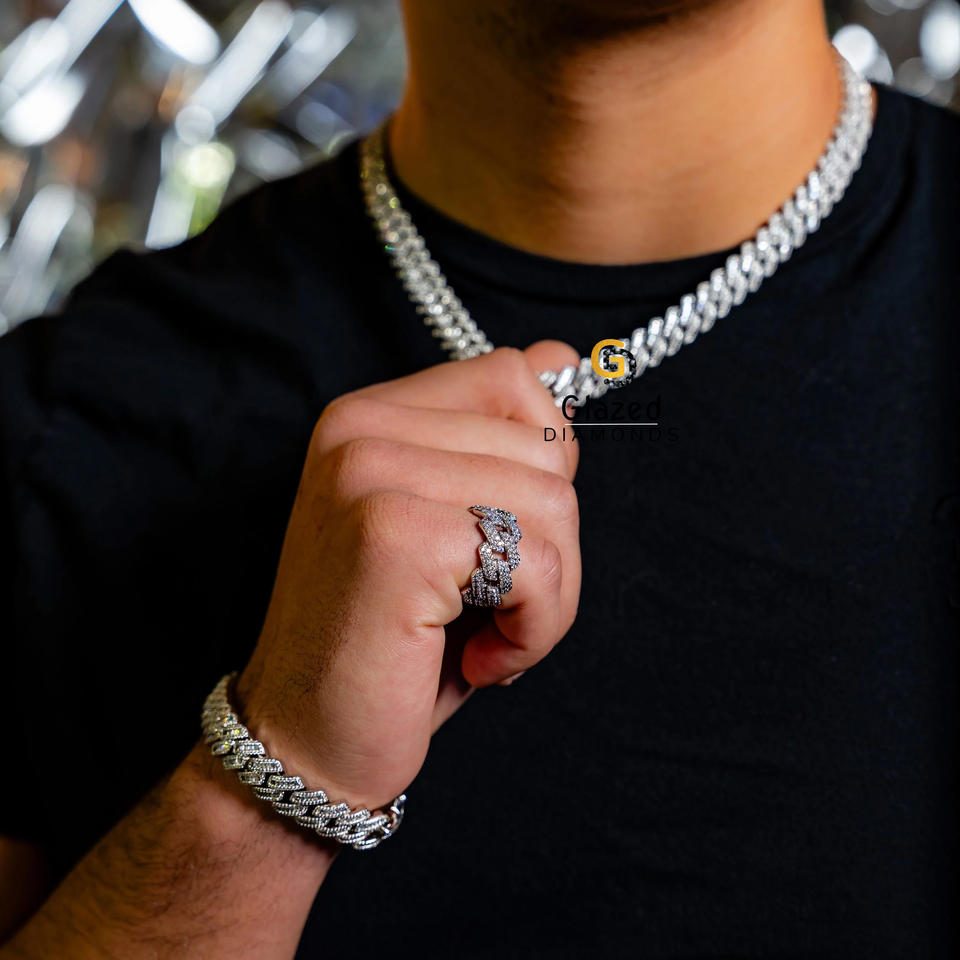 สร้อยข้อมือแบบคิวบาสีขาวทอง10 KT สไตล์ฮิปฮอปน้ำแข็งประดับด้วยทรงกลมและบาแกตต์ตัดแล็บปลูกเพชรสำหรับผู้ชาย
