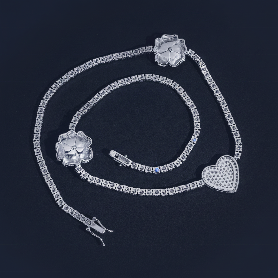 สร้อยคอเทนนิสทรงดอกกุหลาบหัวใจประดับเพชรหลากสีสันเคลือบทองคำขาว 925 เงินแท้ สำหรับผู้หญิง สไตล์ฮิปฮอป