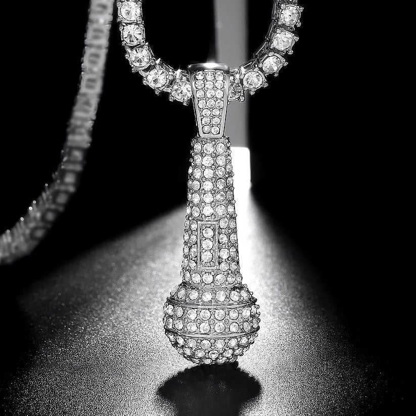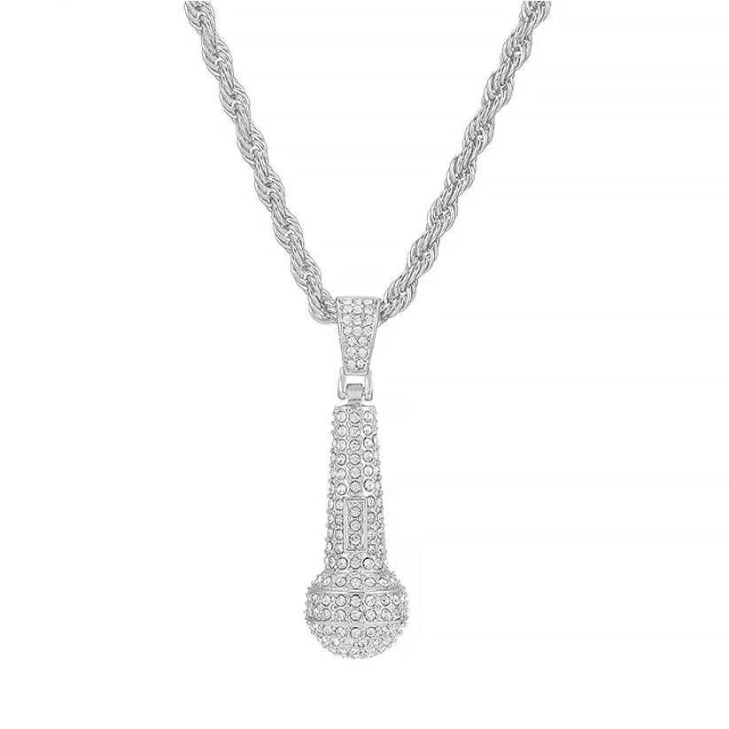 จี้ไมโครโฟนแบบฮิปฮอปประดับคริสตัล พร้อมสายหนังสังเคราะห์สีทอง/เงิน และหัวเข็มขัดโลหะแข็งแรง