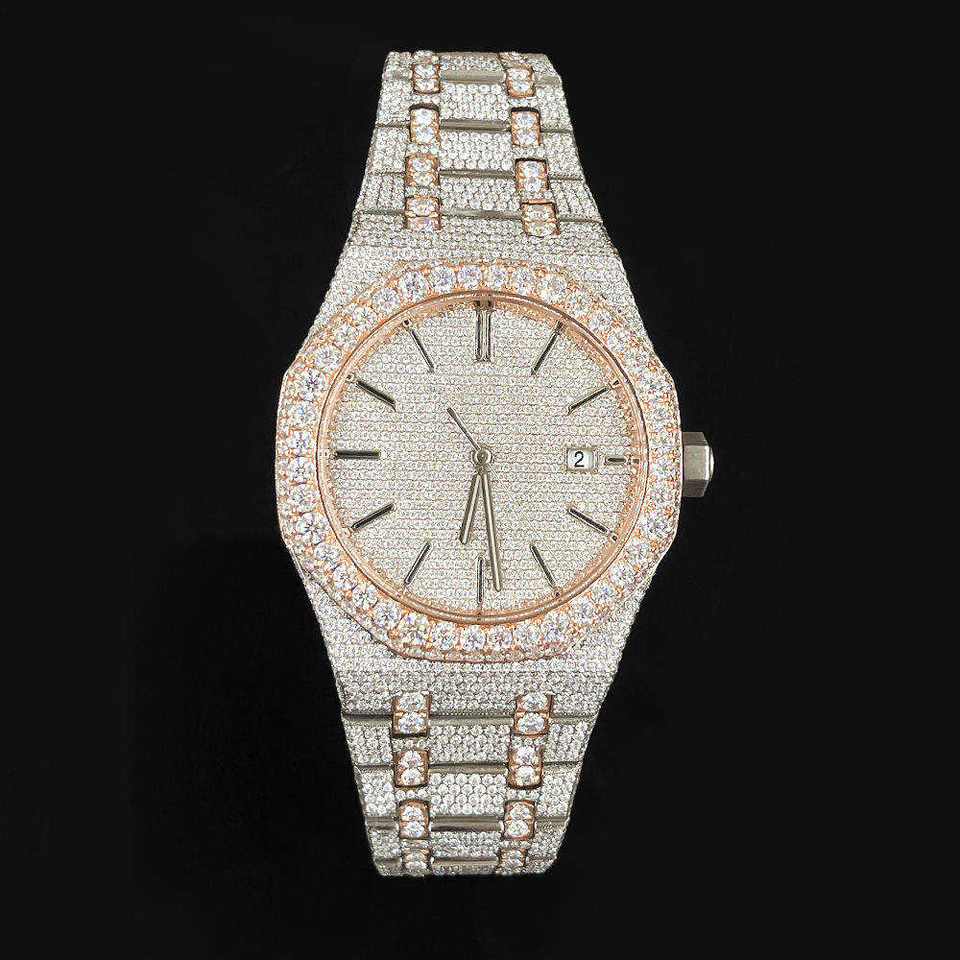 ฮิปฮอป Iced Out VVS Moissanite เพชรนาฬิกาสแตนเลสโลโก้ที่กําหนดเองนาฬิกาสําหรับชาย