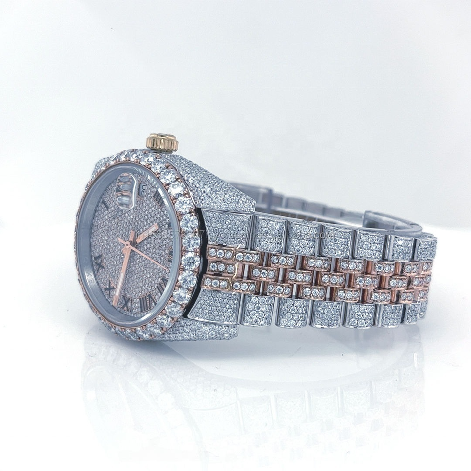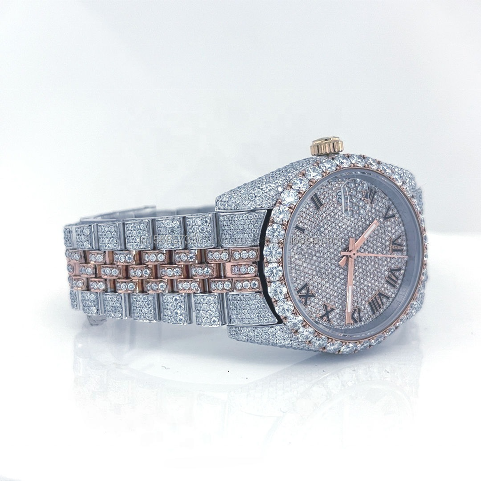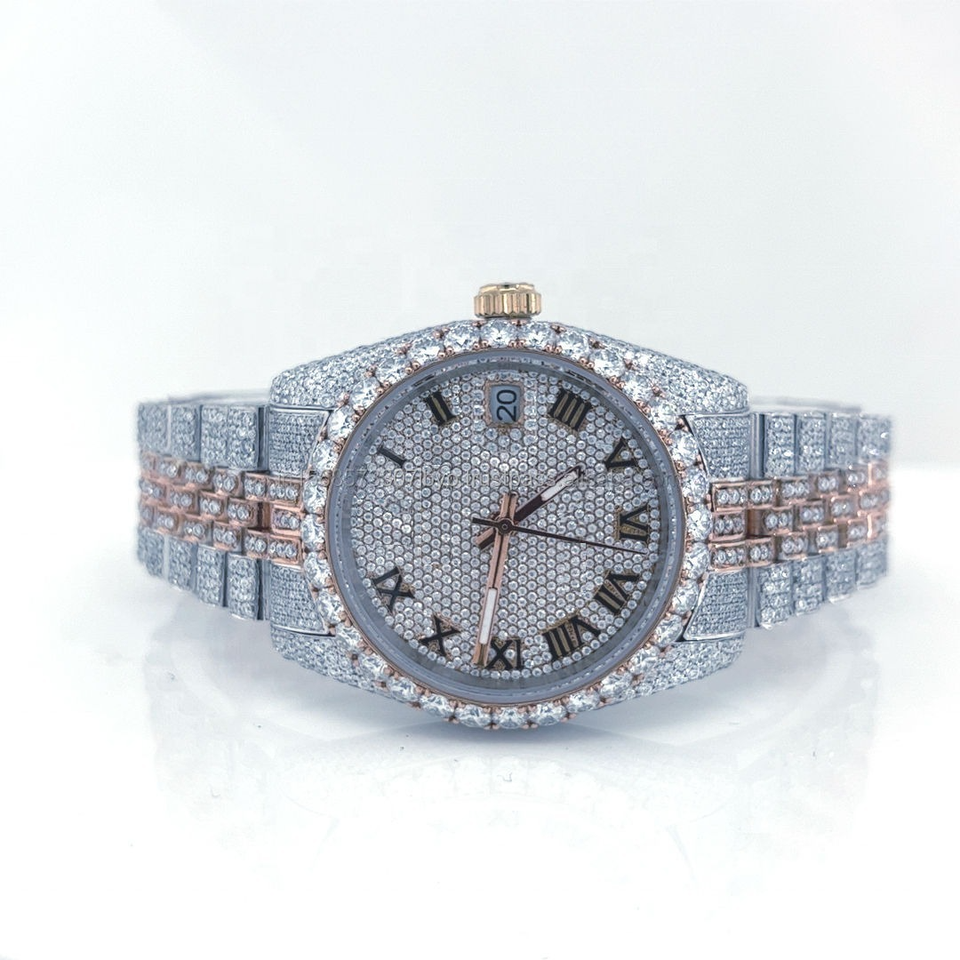 นาฬิกาอัตโนมัติสไตล์ฮิปฮอปประดับเพชรโมอิสซาไนต์ VVS สำหรับผู้ชาย สายโรสโกลด์สุดหรู ดีไซน์แบบ Iced Out นาฬิกาข้อมือแบบกลไกสำหรับนักกีฬาบาสเกตบอล เครื่องประดับ