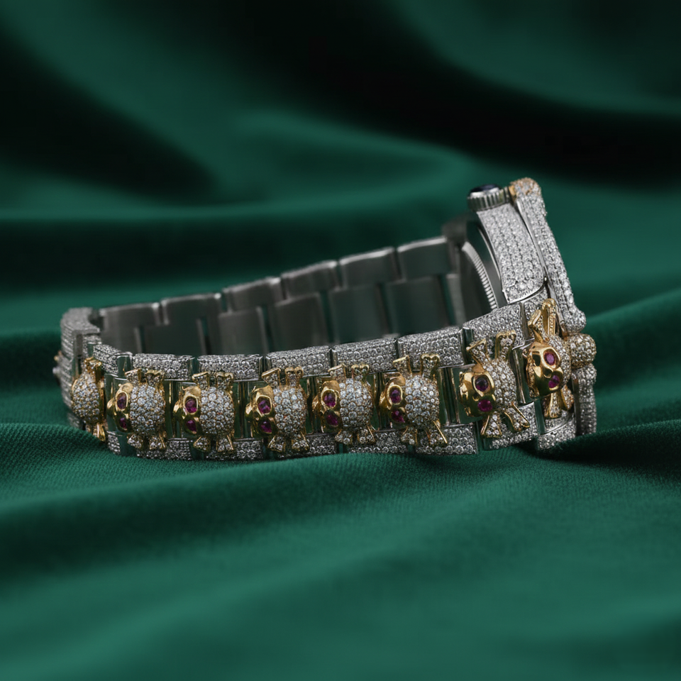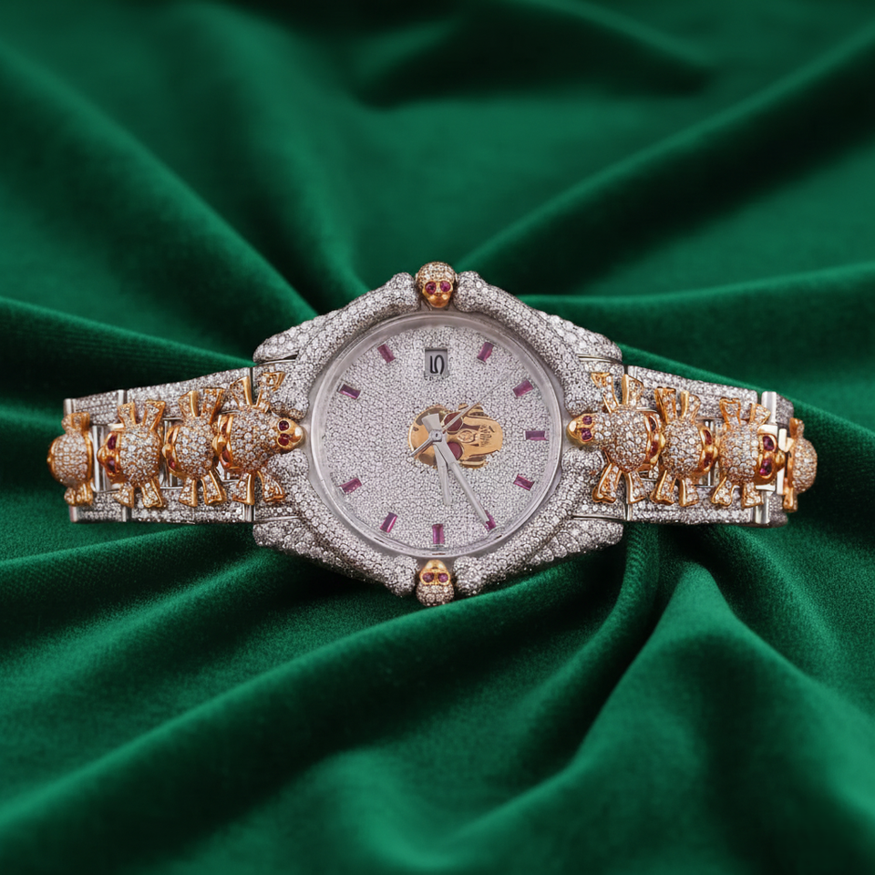 นาฬิกาข้อมือผู้ชายแฟชั่นหรูหราสไตล์ฮิปฮอป สายหนัง ประดับเพชร กันน้ำ หน้าปัดอะนาล็อก