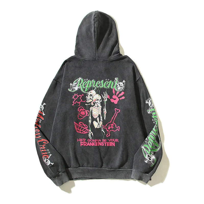 ฮิปฮอปมอนสเตอร์กะโหลกศีรษะพิมพ์คู่เสื้อHooded Retroล้างHoodiesฤดูใบไม้ร่วงผู้ชายหลวมสบายๆท็อปส์Outwear