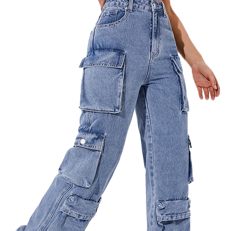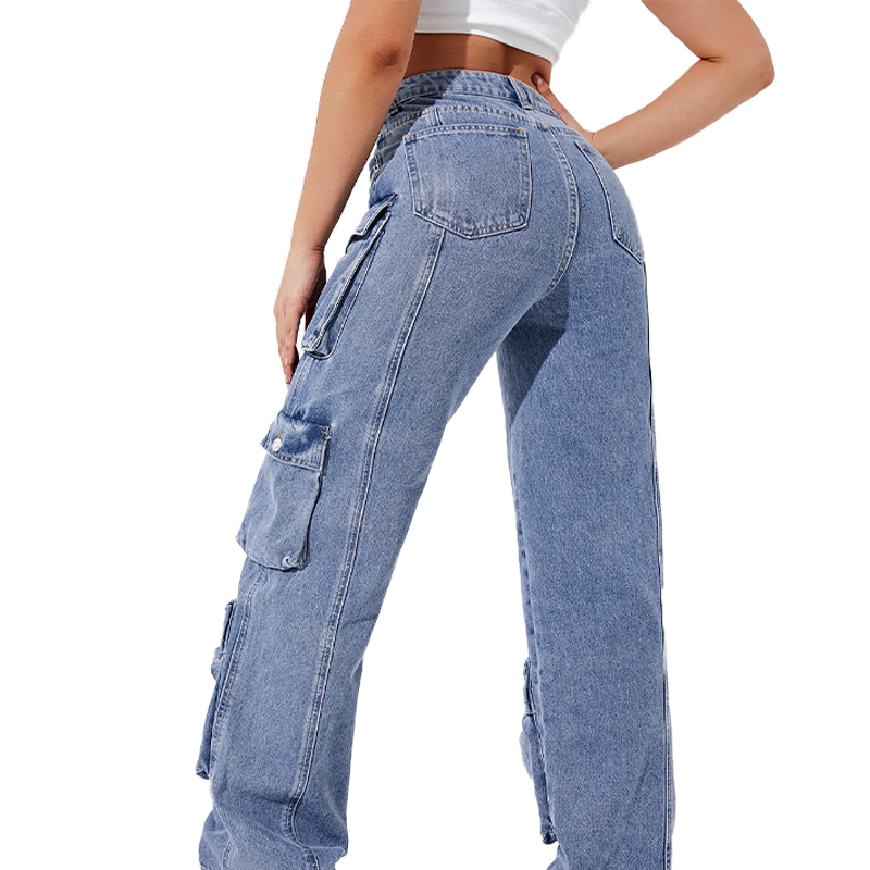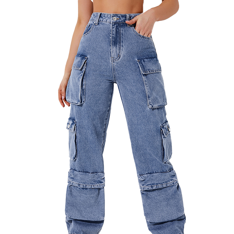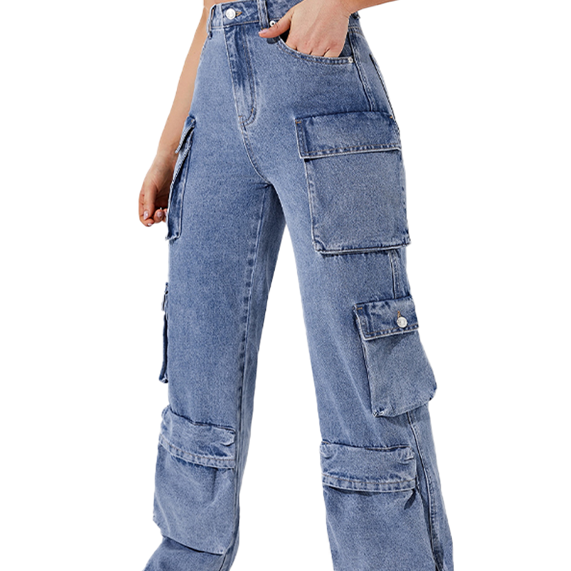 กางเกงยีนส์คาร์โก้ทรงหลวมเอวสูงสไตล์บอยเฟรนด์ หลายกระเป๋า ขาบาน ผ้าเดนิมเนื้อนุ่มสำหรับผู้หญิง