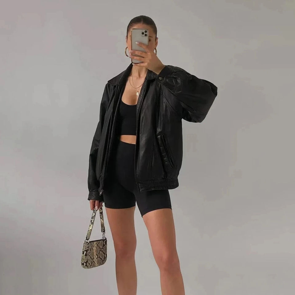 เสื้อแจ็คเก็ตหนังฮิปฮอปทรงโอเวอร์ไซส์ ระบายอากาศได้ดี กันลม แฟชั่นผู้หญิงไซส์ใหญ่ สำหรับฤดูใบไม้ผลิและฤดูใบไม้ร่วง รุ่นยอดนิยม