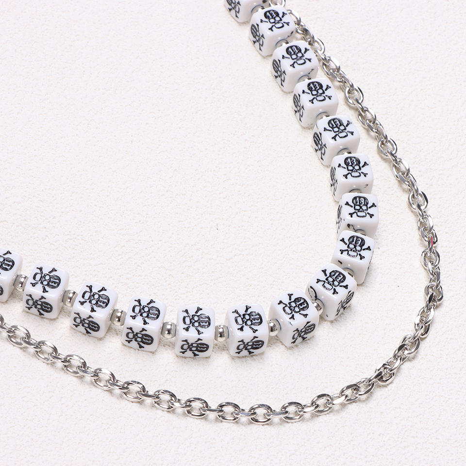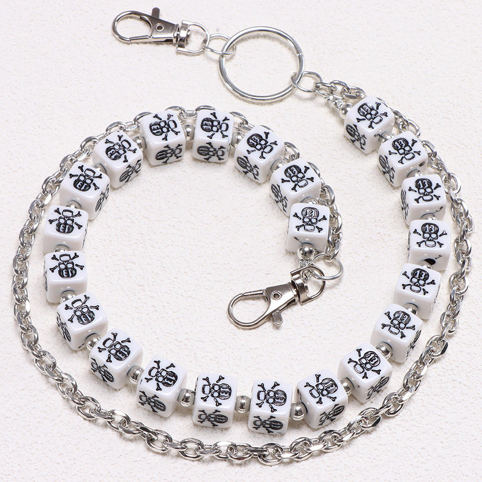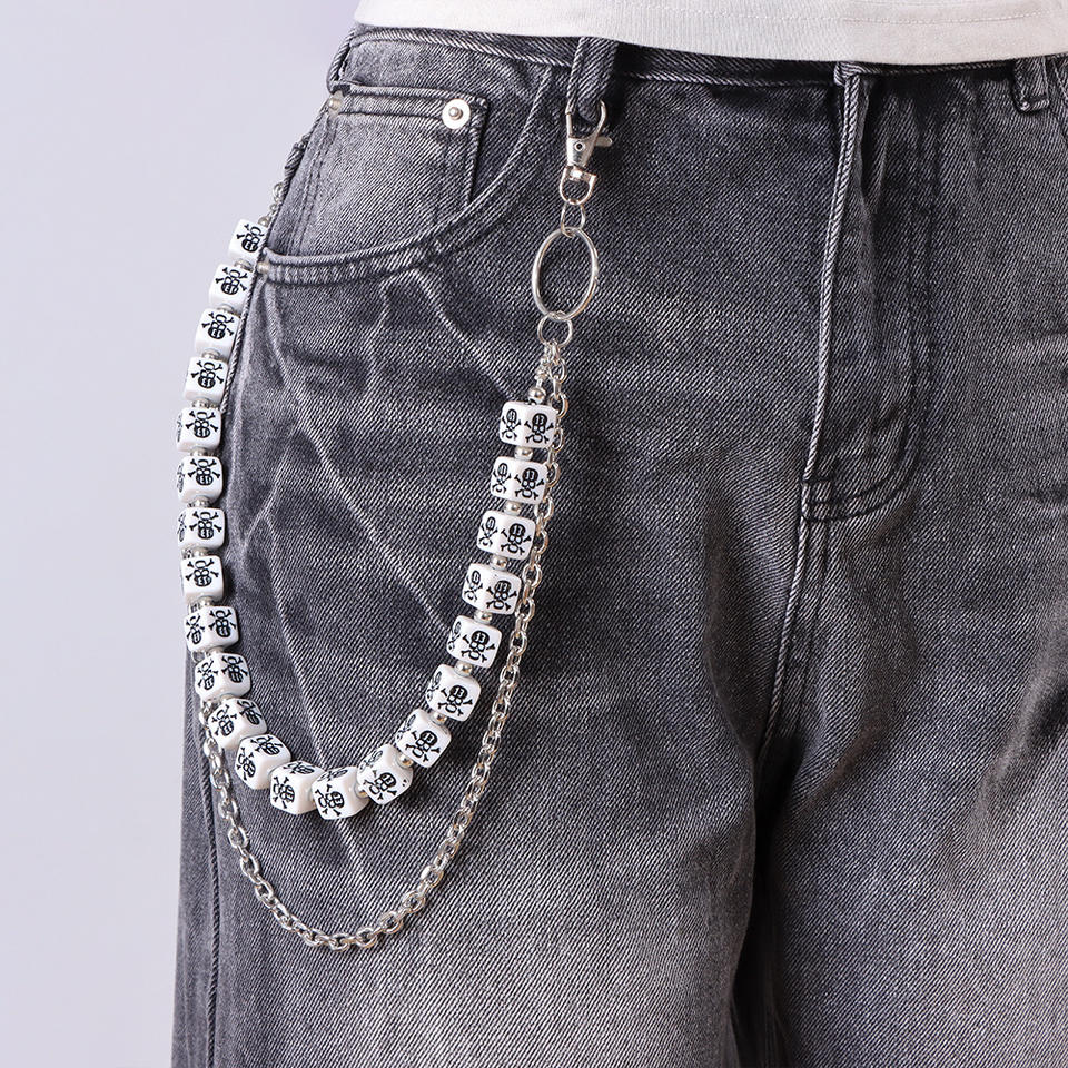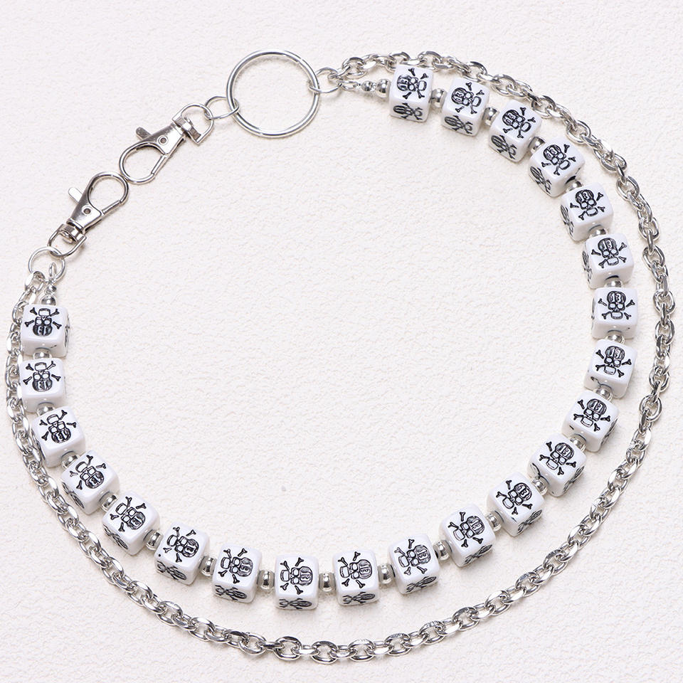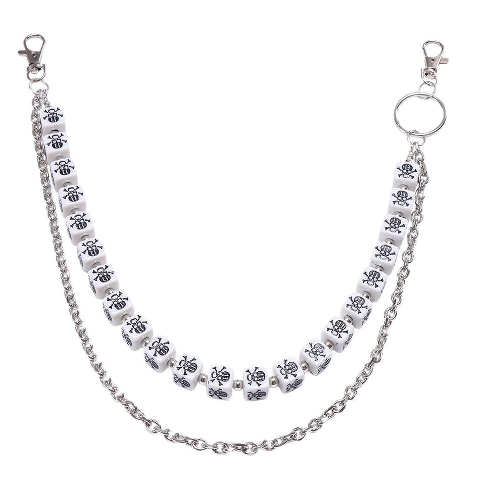 โซ่กางเกงหัวกะโหลกประดับลูกปัดสีขาวสองชั้น