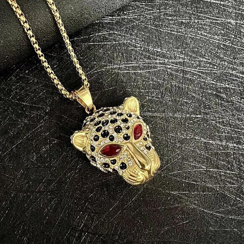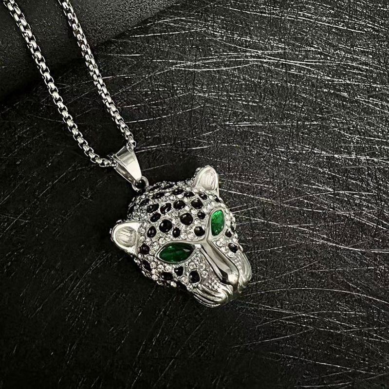 จี้สร้อยคอสแตนเลสสตีลสไตล์ฮิปฮอป ประดับเพชรสีเขียวและสีแดง ดีไซน์หัวเสือดาว