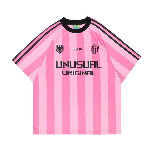 เสื้อยืดแขนสั้นสไตล์สปอร์ตสีชมพูลายทางแนวฮิปฮอป ทรงหลวมใส่สบายสำหรับทุกเพศ