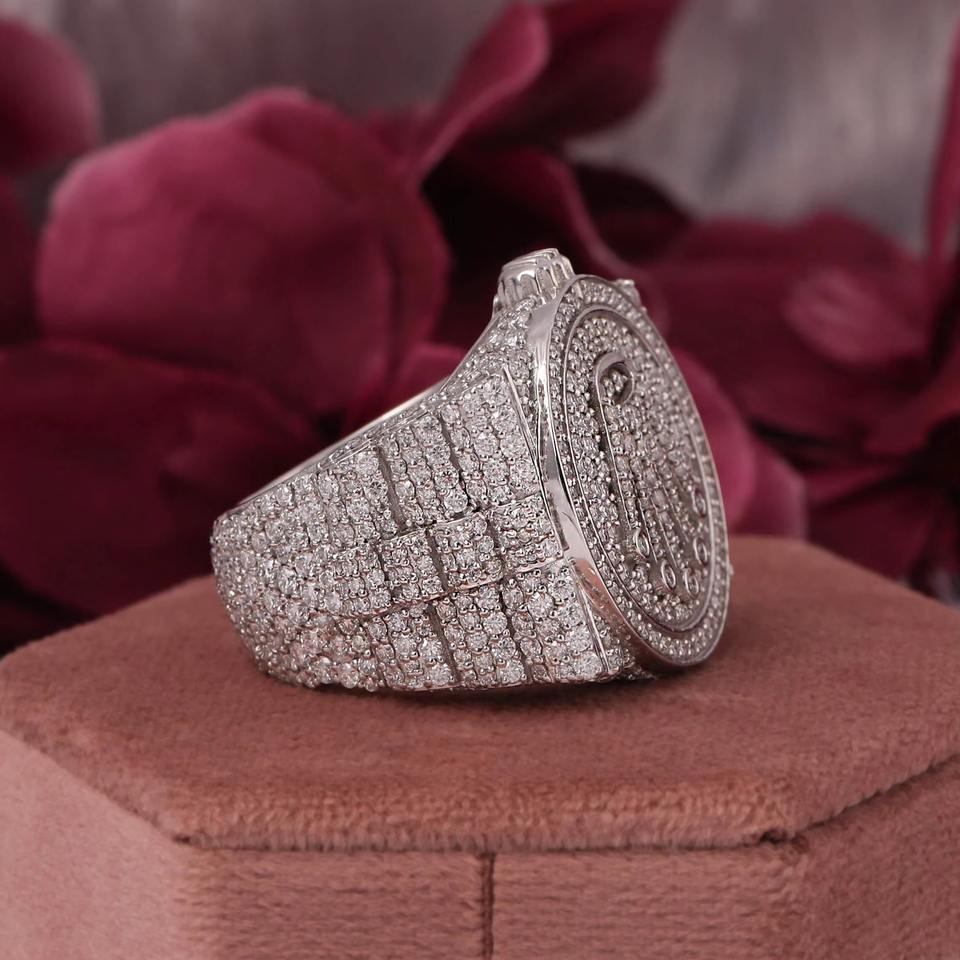 แหวนเพชรฮิปฮอปสไตล์ฮิปฮอปแบบกลมตัดสไตล์ฮิปฮอปสำหรับผู้ชายแหวนเพชรโมอิสซาไนต์สีเงินแบบใหม่ตามเทรนด์ที่กำหนดเอง