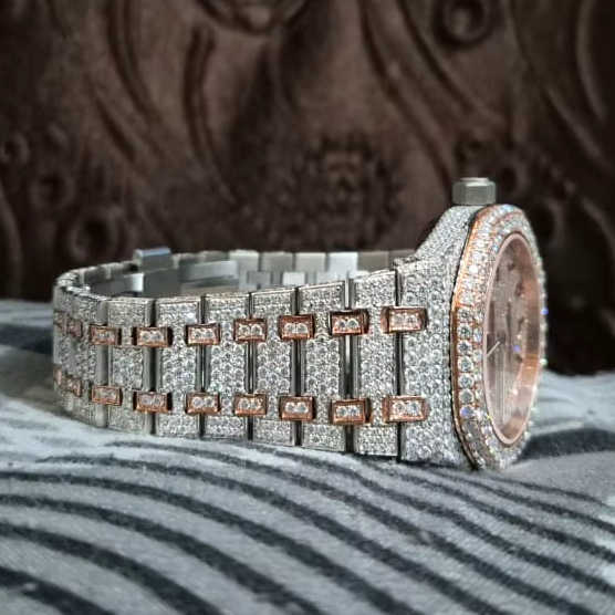 นาฬิกาสปอร์ตหรูหราสำหรับผู้ชาย ดีไซน์ฮิปฮอป ประดับด้วยโมอิสซาไนต์สี D เกรด VVS พร้อมสายหนังสีทองเหลือง หน้าปัดแบบเข็ม และกระจก