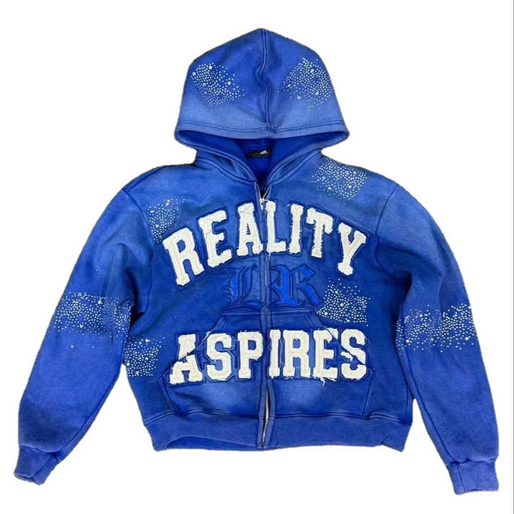 เสื้อฮู้ดดี้ฮิปฮอปสไตล์วินเทจทรงปกติ ซิปหน้า ผ้าฟลีซระบายอากาศได้ดี น้ำหนัก 460 กรัม ผ้าฝ้ายเนื้อหนา สตรีทแวร์ โลโก้ประดับเพชร สำหรับผู้ชาย