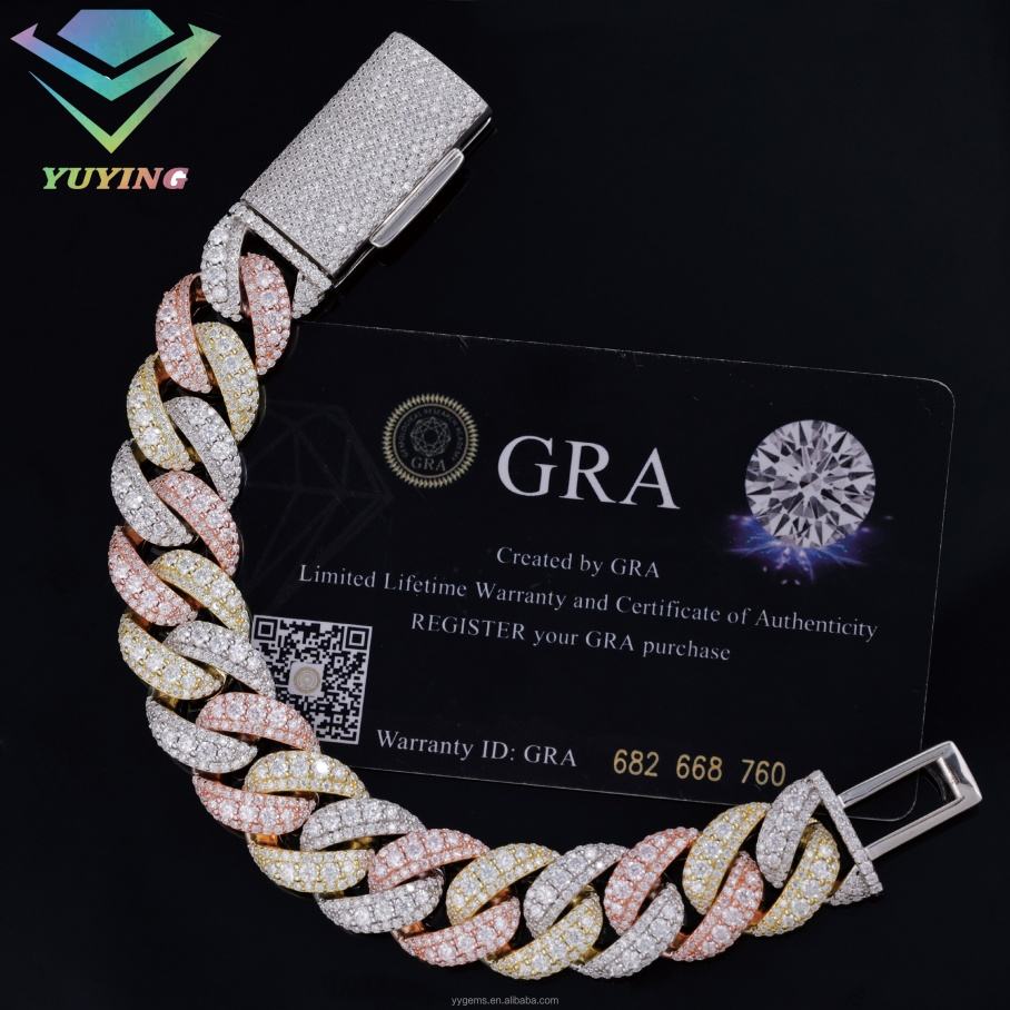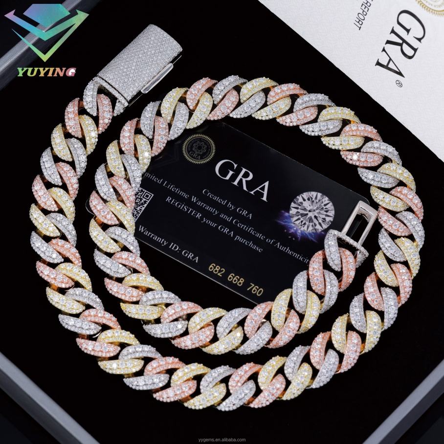 สร้อยคอผู้ชายแบบฮิปฮอป สีขาว โรสโกลด์ ไตรรงค์ ประดับเพชรโมอิสซาไนต์ สร้อยคิวบาลิงค์เงินแท้ S925 ระดับ VVS