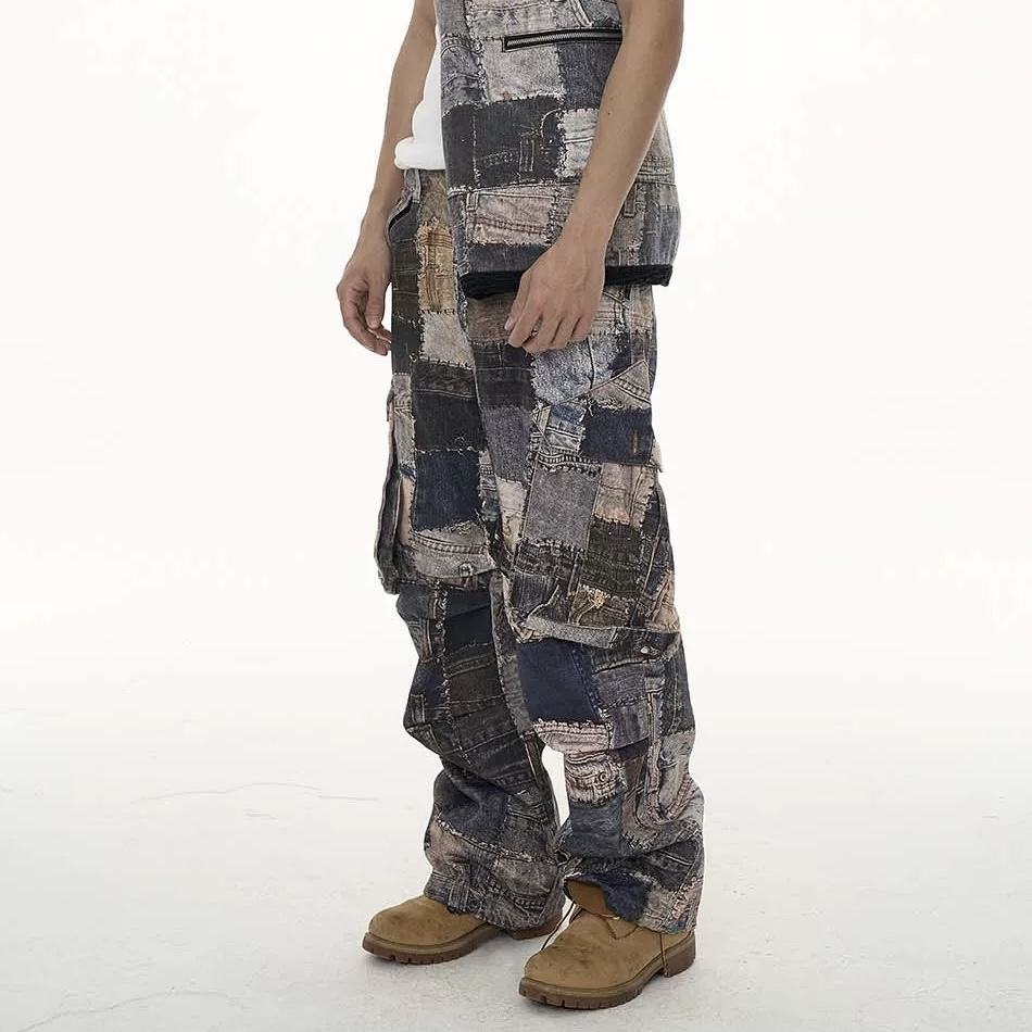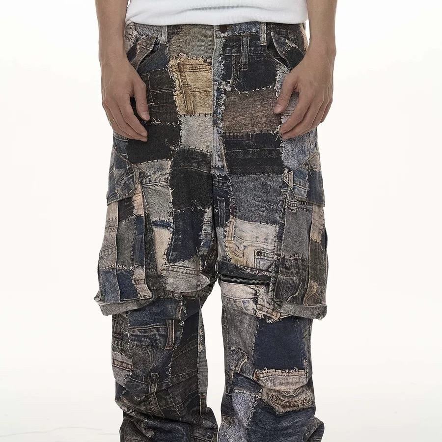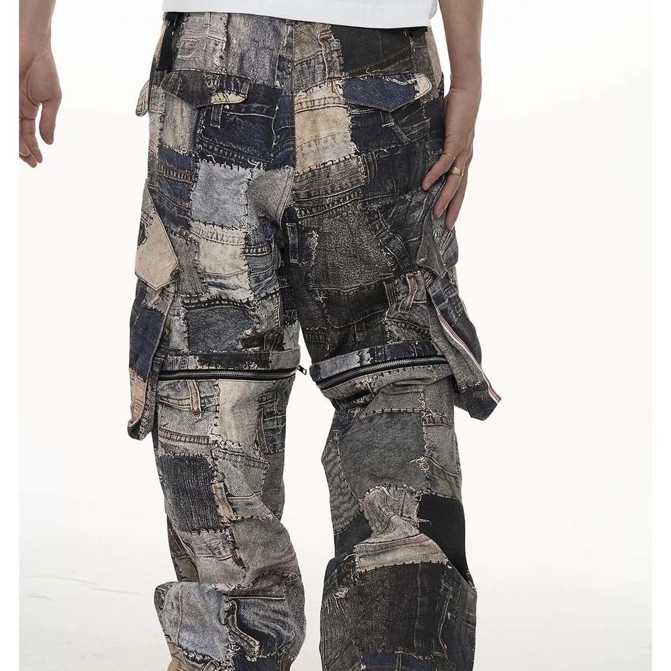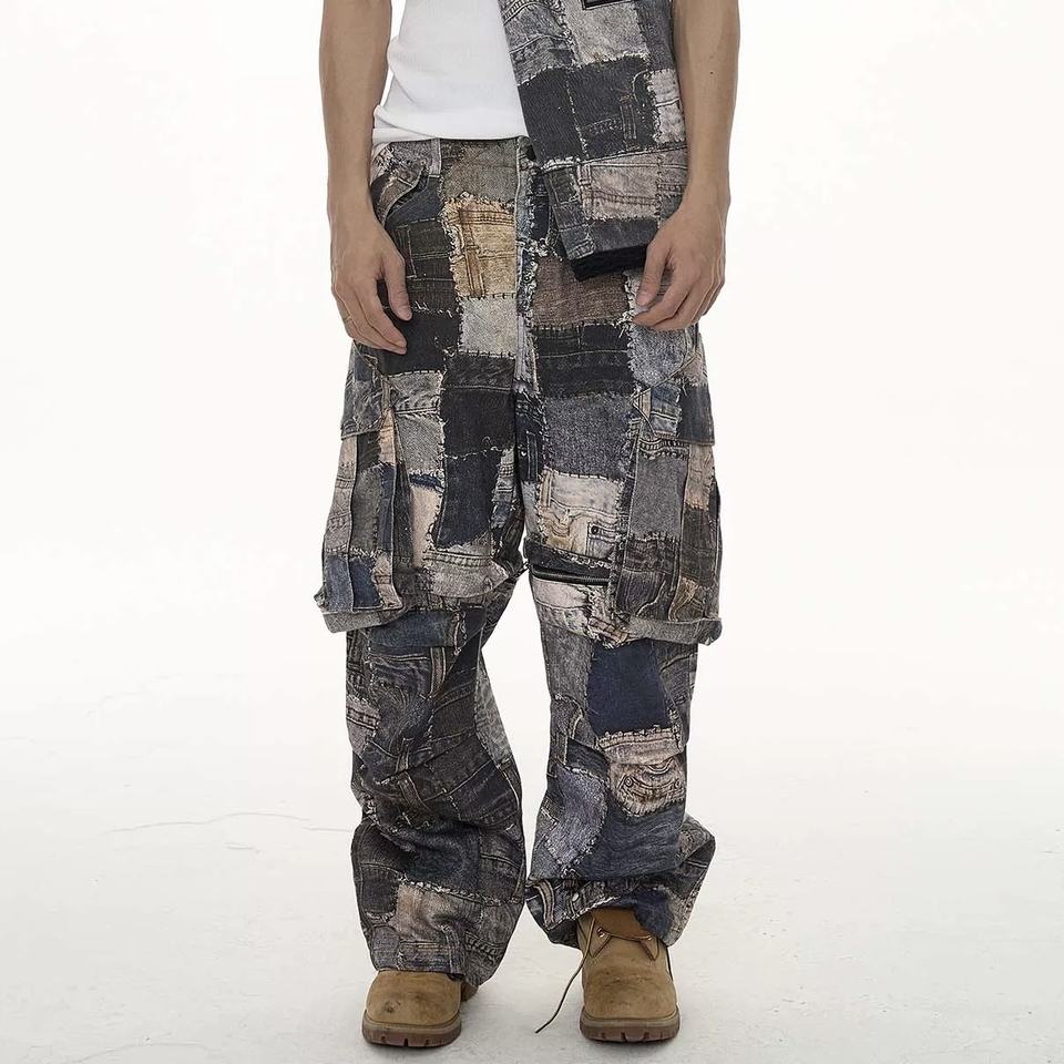 กางเกงผ้ายีนส์ขาบานคาร์โก้สองชิ้นแบบปักลายดิจิตอลงานเย็บปะสไตล์ฮิปฮอป