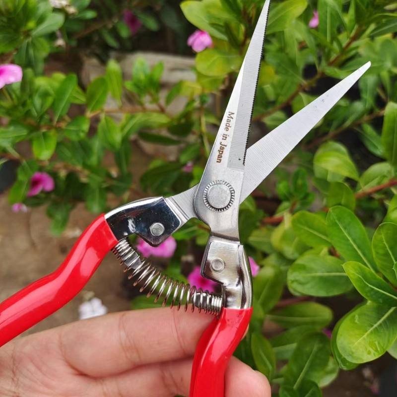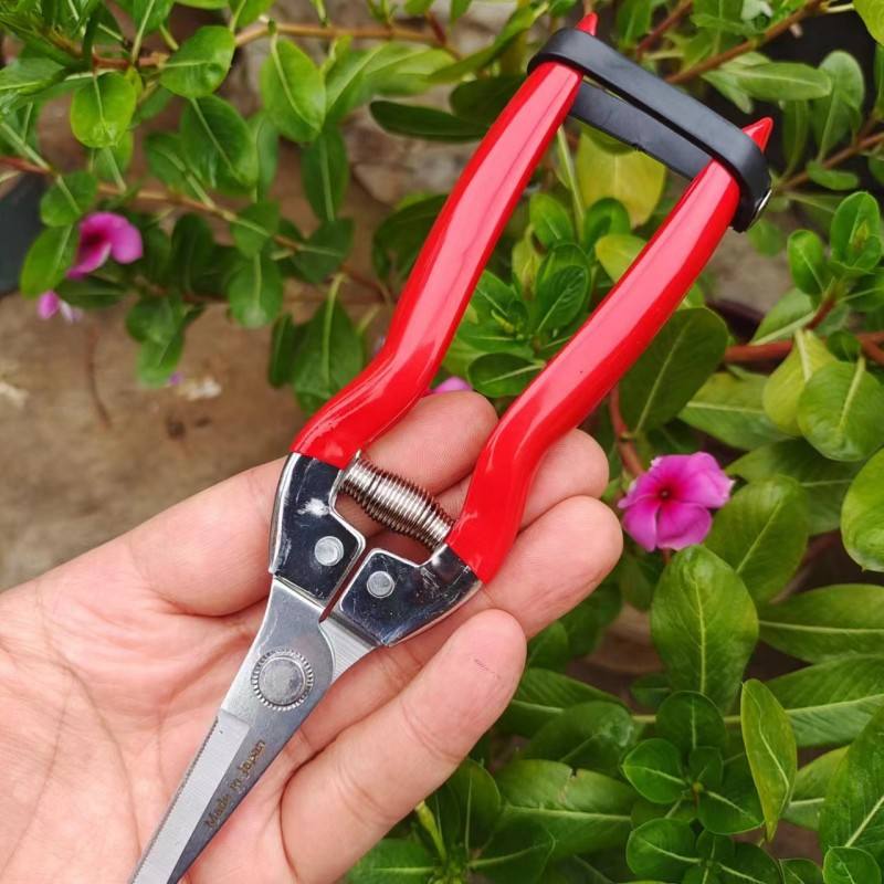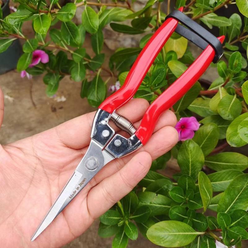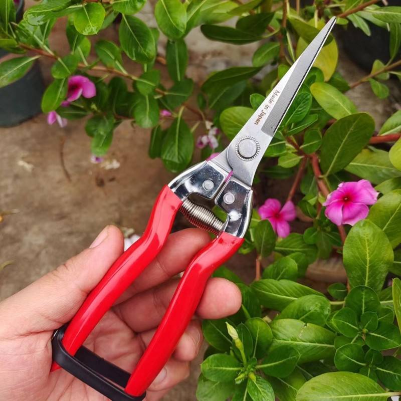 กรรไกรตัดกิ่งฮิไซจิโร่ ใบมีดสแตนเลส 1.5 มม. ด้ามจับสีแดง โครงสร้างแบบผีเสื้อ ใช้สำหรับตัดแต่งสวน ต้นไม้ผลไม้