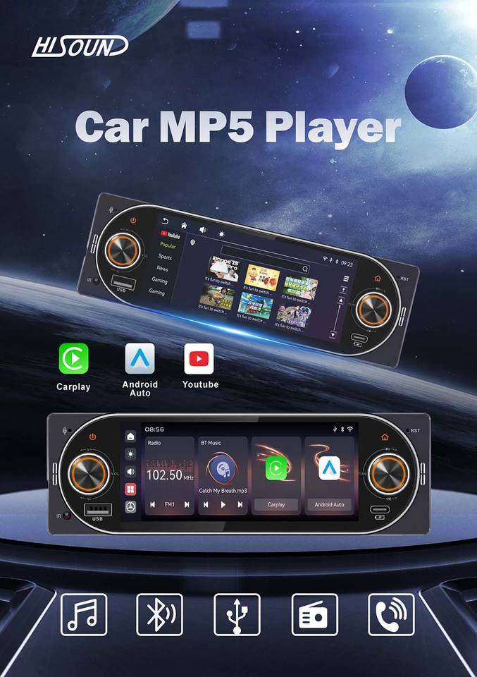 Hisound เครื่องเสียงรถยนต์5นิ้ว DIN เดี่ยวพร้อม6RCA RDS Carplay Youtube Wi-Fi เครื่องเล่น MP5ในรถยนต์วิทยุในรถยนต์