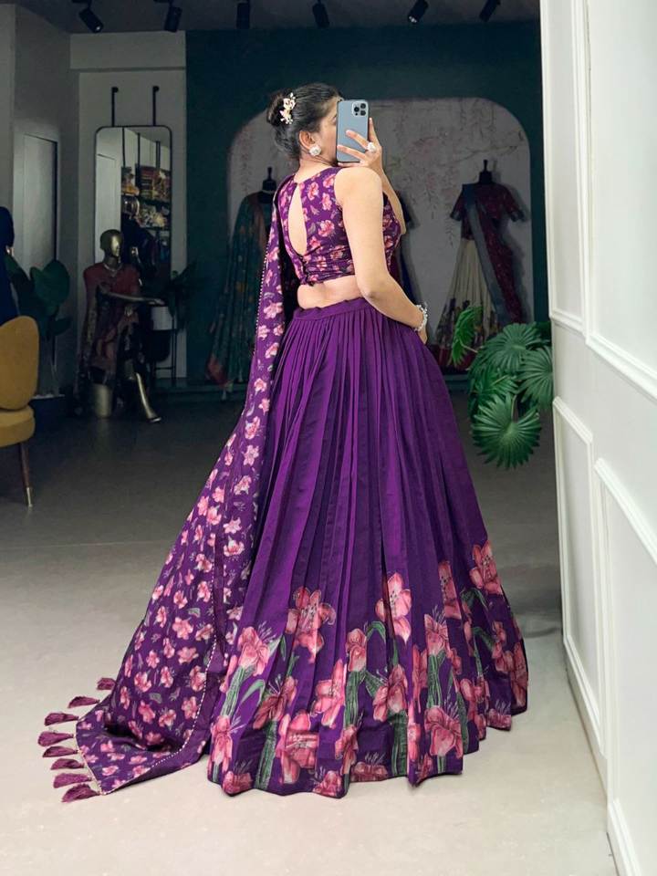 ชุดเดรสผ้าไหมสไตล์ราจาธานสีดำและสีม่วงพิมพ์ลายดอกไม้ชุดเดรส Lahenga