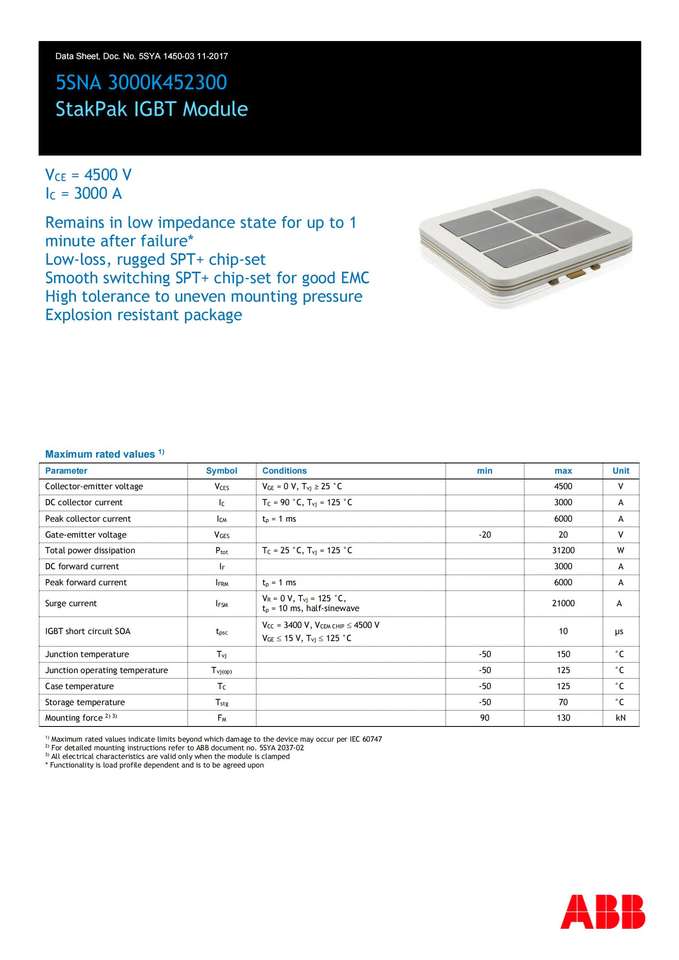 โมดูล IGBT Hitachi Energy 5SNA 3000K452300 แบบ StakPak 4500V 2500A HVDC สำหรับเบรกเกอร์ FACTS และการใช้งานพลังงานแบบพัลส์