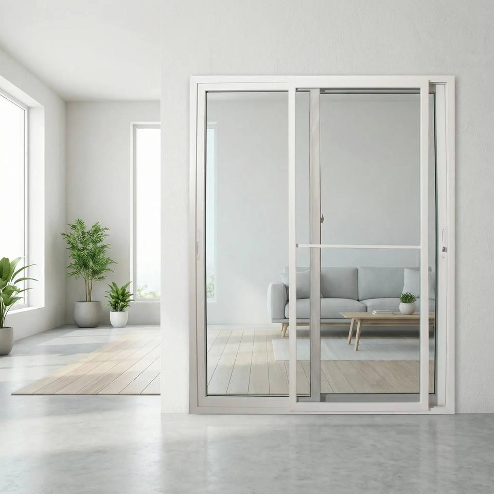 ประตูบานเลื่อน Hoffen Pro uPVC ขนาด 200x205 สีขาว พร้อมกระจกตาข่าย กันเสียง กันน้ำ ป้องกันความร้อน จากประเทศไทย