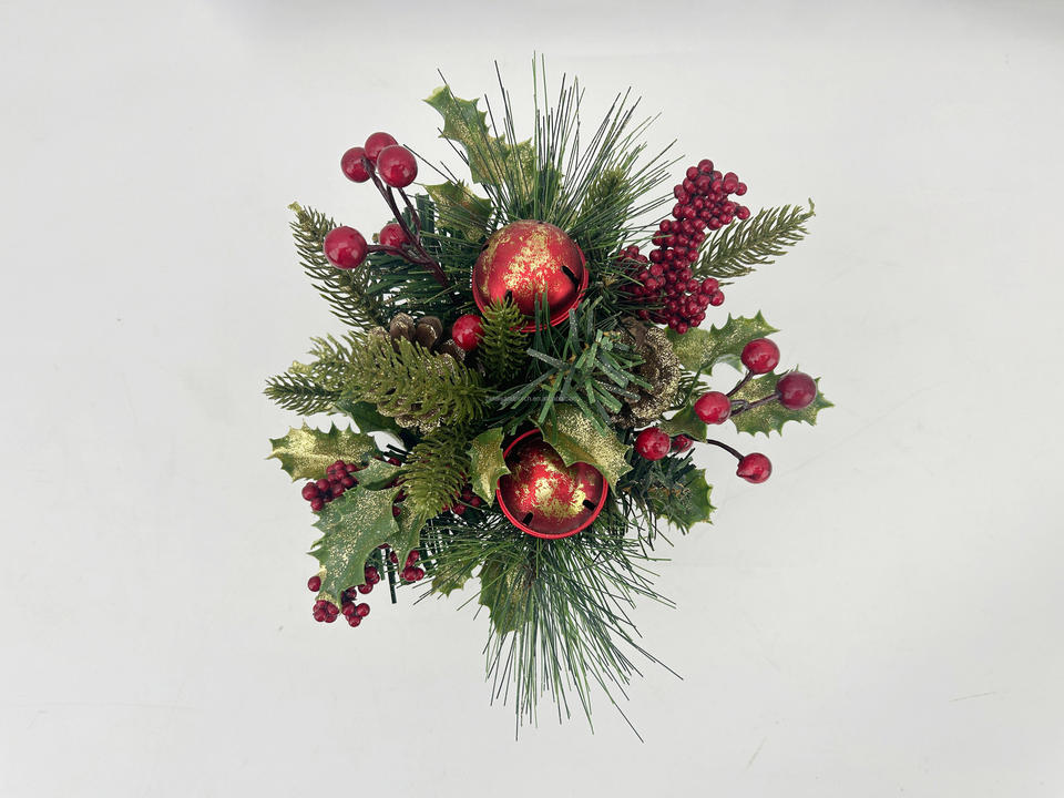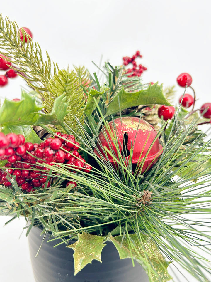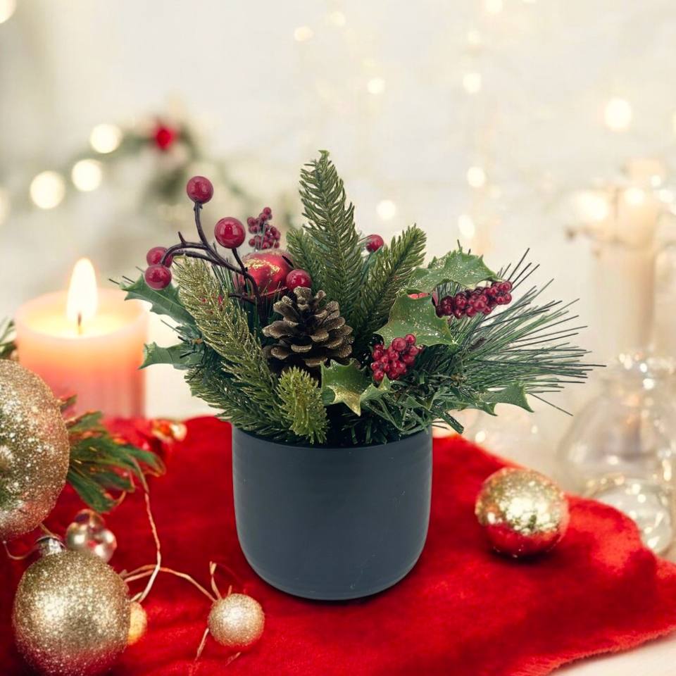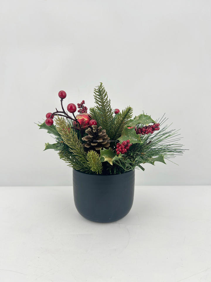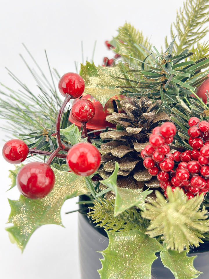 การจัดดอกไม้คริสต์มาสแบบประดับกลิตเตอร์ลายสนและผลเบอร์รี่ในกระถางสีดำ สำหรับตกแต่งโต๊ะในเทศกาล