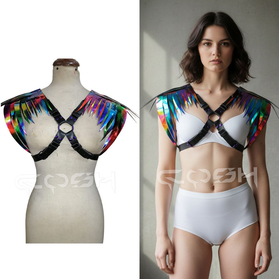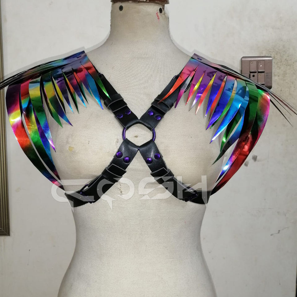 สายรัดรูปปีกสีรุ้งโฮโลแกรมพร้อมโครงรูปตัว X ทำจากหนังวีแกนสีดำและฮาร์ดแวร์สีม่วงเมทัลลิก