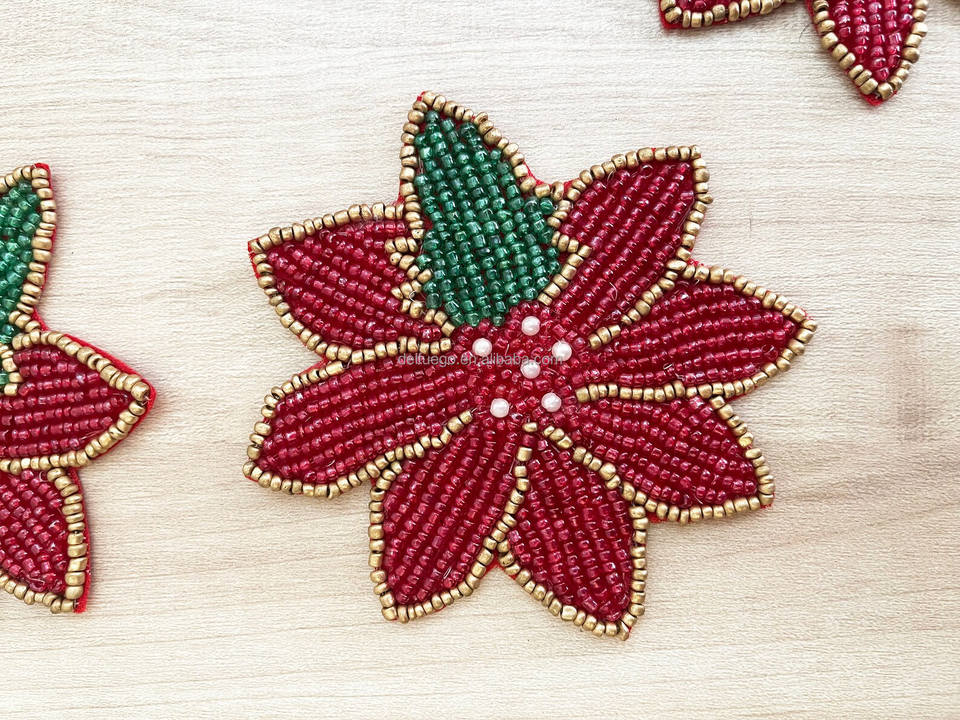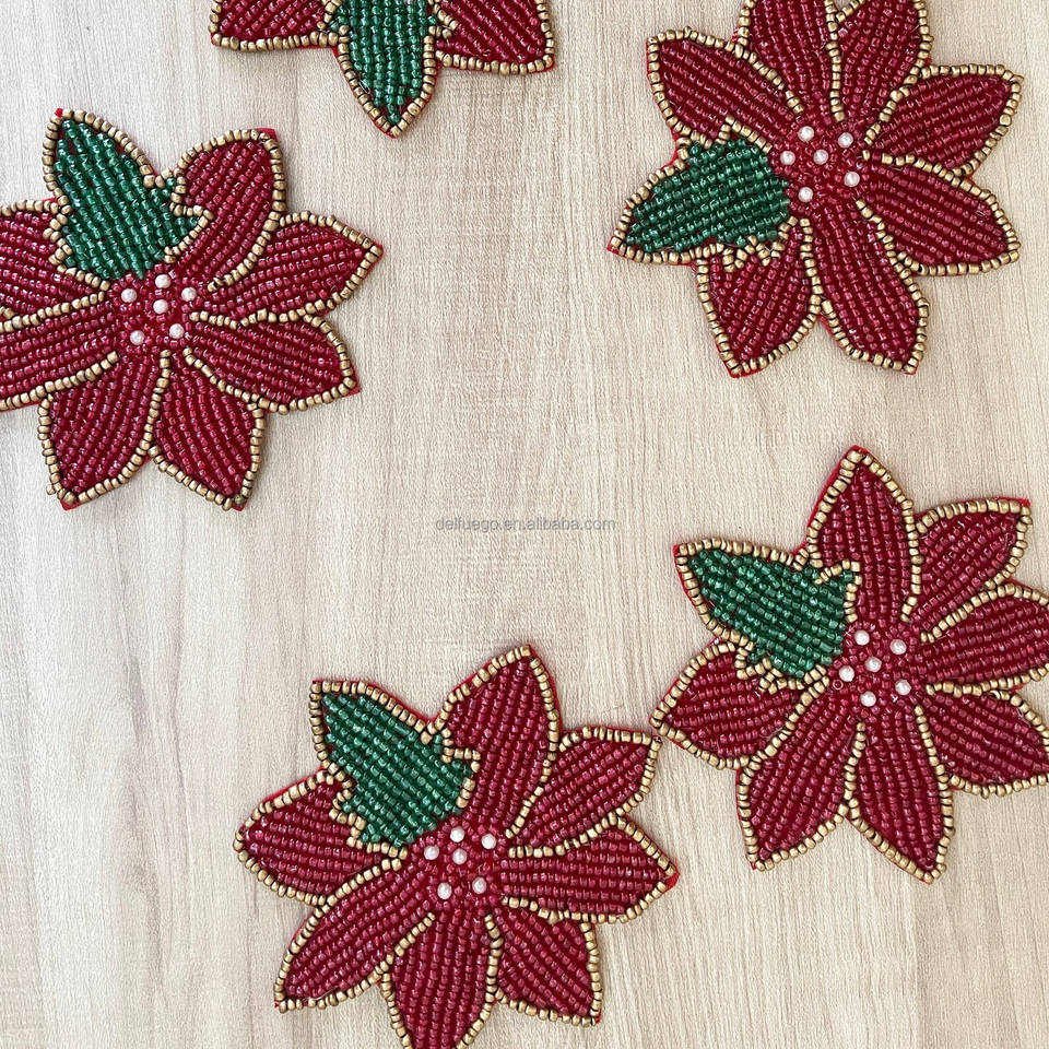 แผ่นรองจานลูกปัดสีแดงงานแฮนด์เมดประดับบ้านแผ่นรองจานสั่งทำสำหรับโต๊ะอาหารขายส่งรูปดอกไม้สีแดง