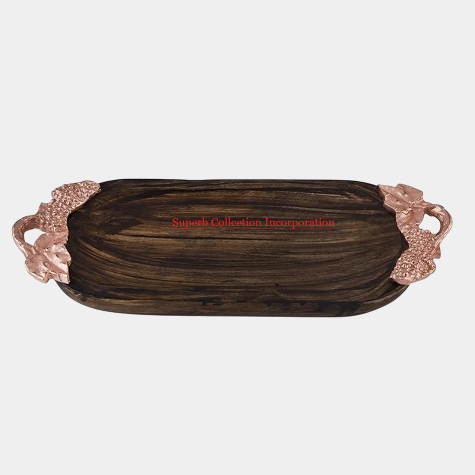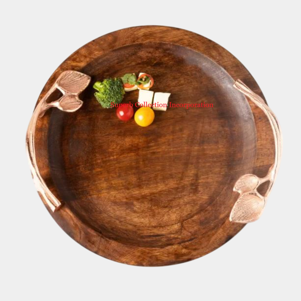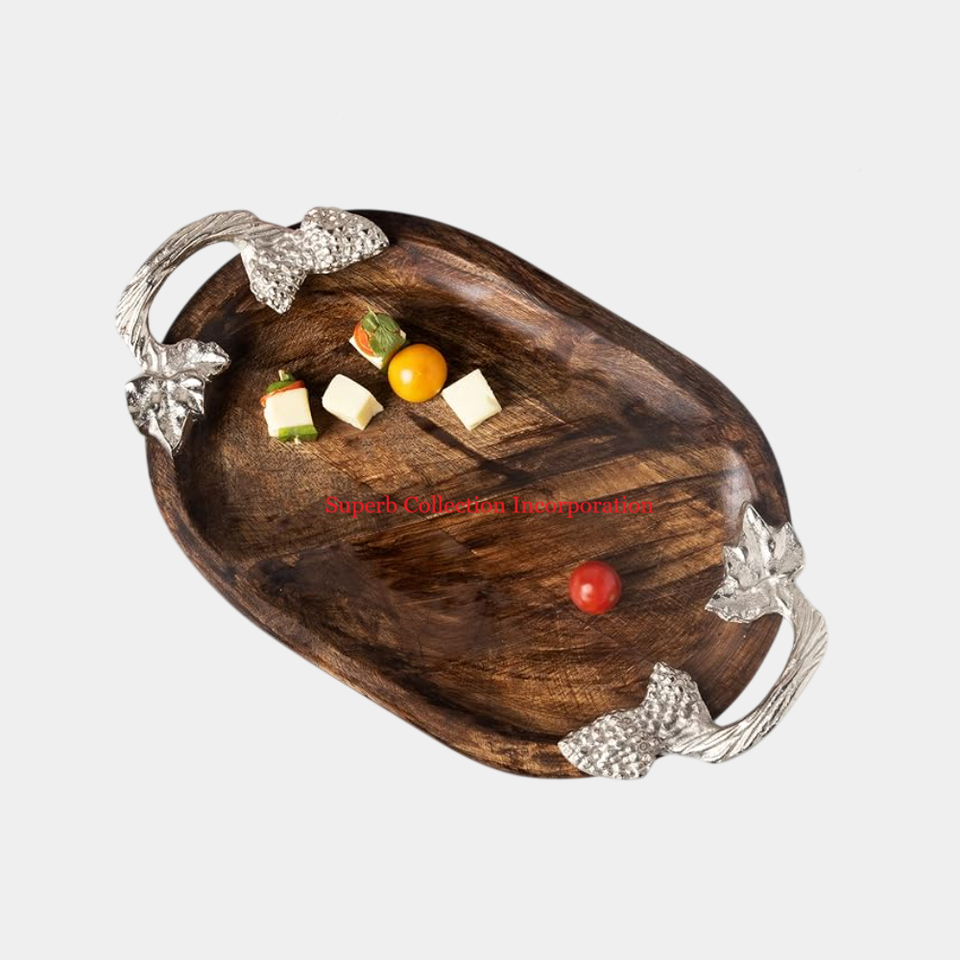 ถาดไม้ธรรมชาติสำหรับตกแต่งบ้านถาดเสิร์ฟอาหารดีไซน์แฟนซีพร้อมที่จับรูปใบไม้สำหรับถาดบนโต๊ะอาหาร