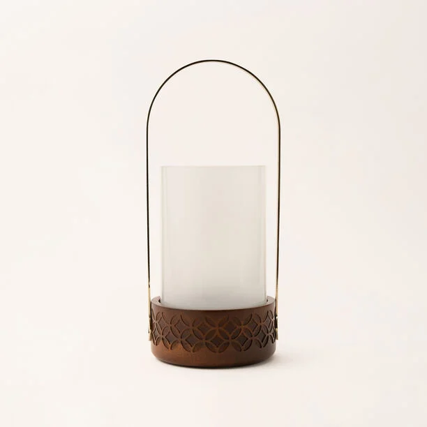 Treanding Wind Light T Light Holder With Wooden Base Glass Pit and Metal Handle on Top