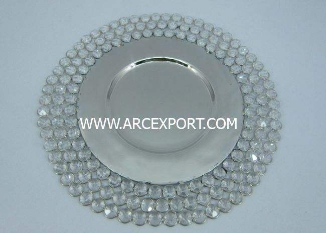 จานที่ชาร์จอาหารสำหรับอาหารเย็นที่บ้านทำจากกัลวาไนซ์ทรงกลมดีไซน์บนโต๊ะจานโชว์งานเลี้ยงงานแต่งงานและจานสำหรับเครื่องใช้ในโรงแรม