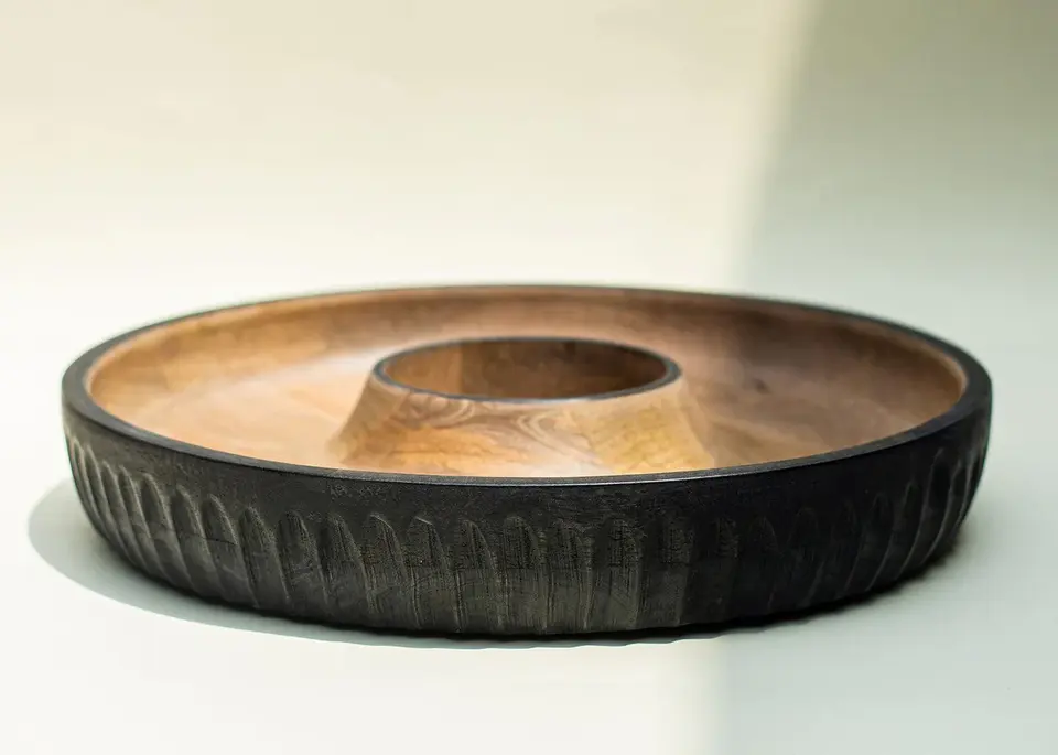 ถาดไม้ทรงกลมพร้อมชามตรงกลางสำหรับใส่ซอสและดิปจานเสิร์ฟอาหารเรียกน้ำย่อย