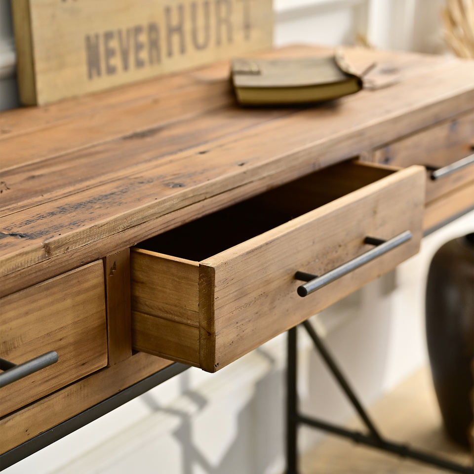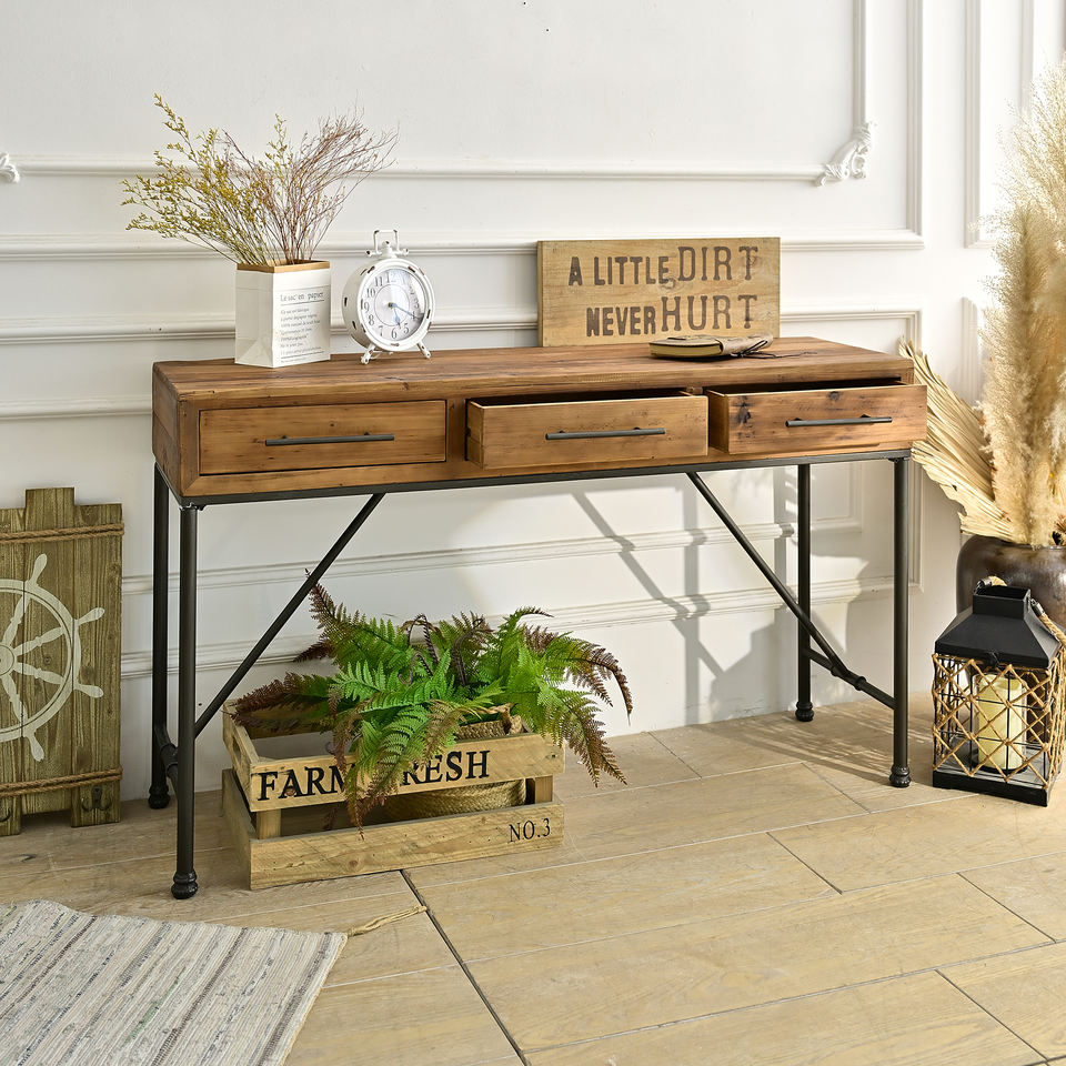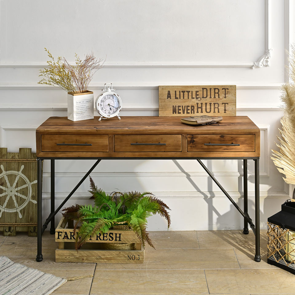 โต๊ะคอนโซลไม้เนื้อแข็งสไตล์เรียบง่าย ขาโลหะ พร้อมลิ้นชัก 3 ช่อง ทนทาน เหมาะสำหรับห้องนั่งเล่น โถงทางเข้า โรงแรม อพาร์ตเมนต์