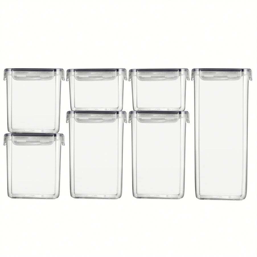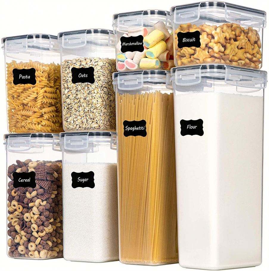 กล่องเก็บของพลาสติกใสหลายรุ่นที่เก็บอาหารในห้องครัวพร้อมฝาปิด