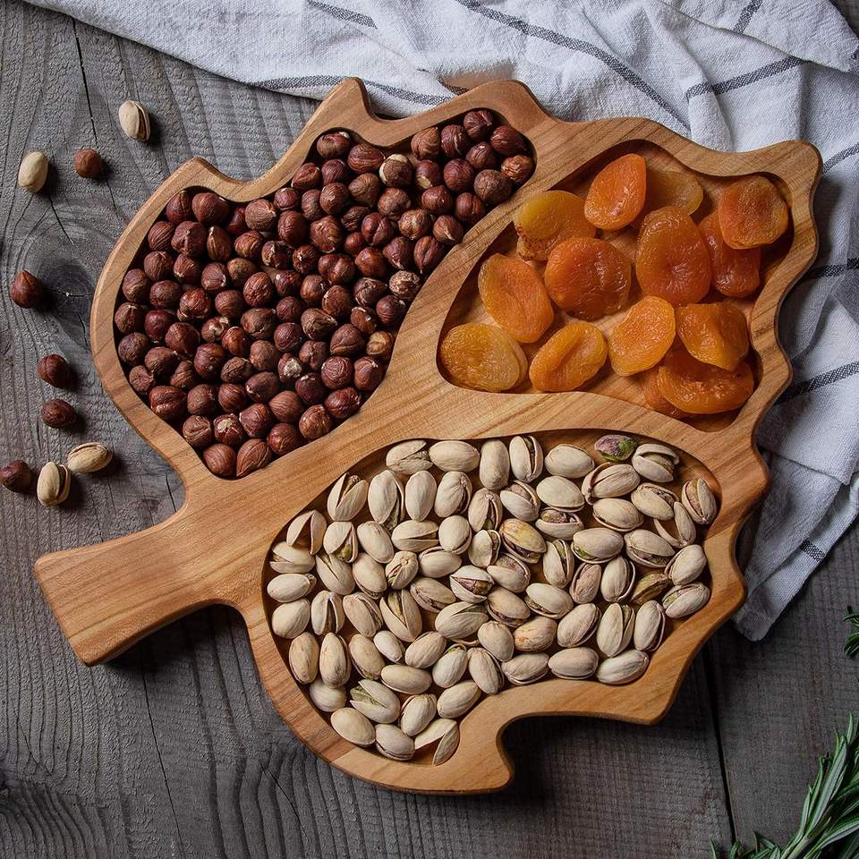 ถาดไม้และจานอาหารเรียกน้ำย่อย3ส่วนรูปหัวใจสำหรับงานเลี้ยงในบ้านถาดไม้เป็นมิตรกับสิ่งแวดล้อม