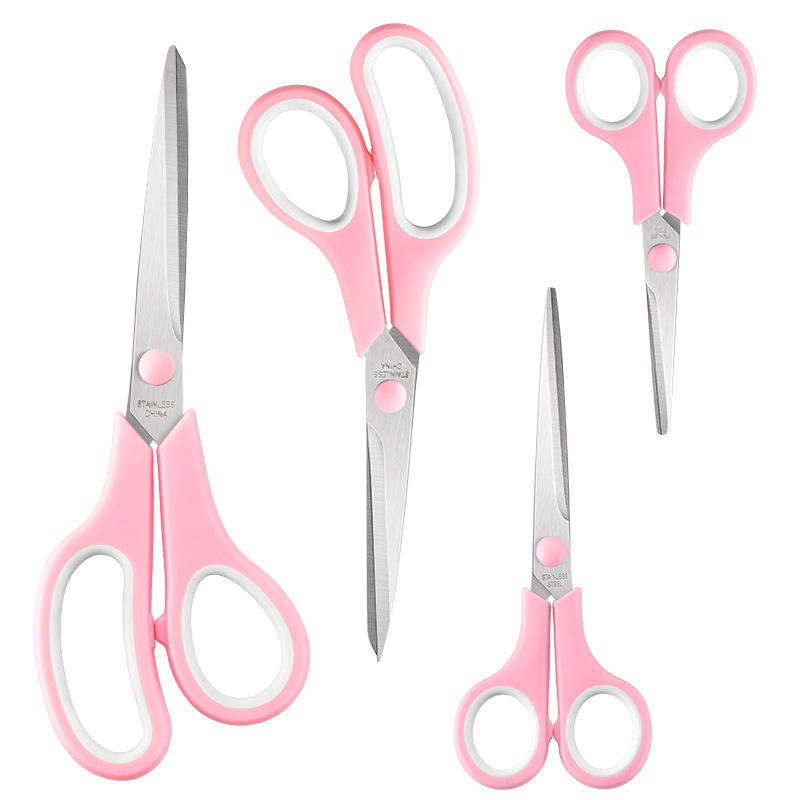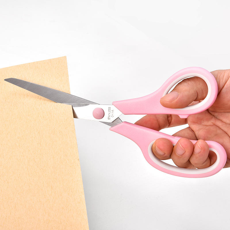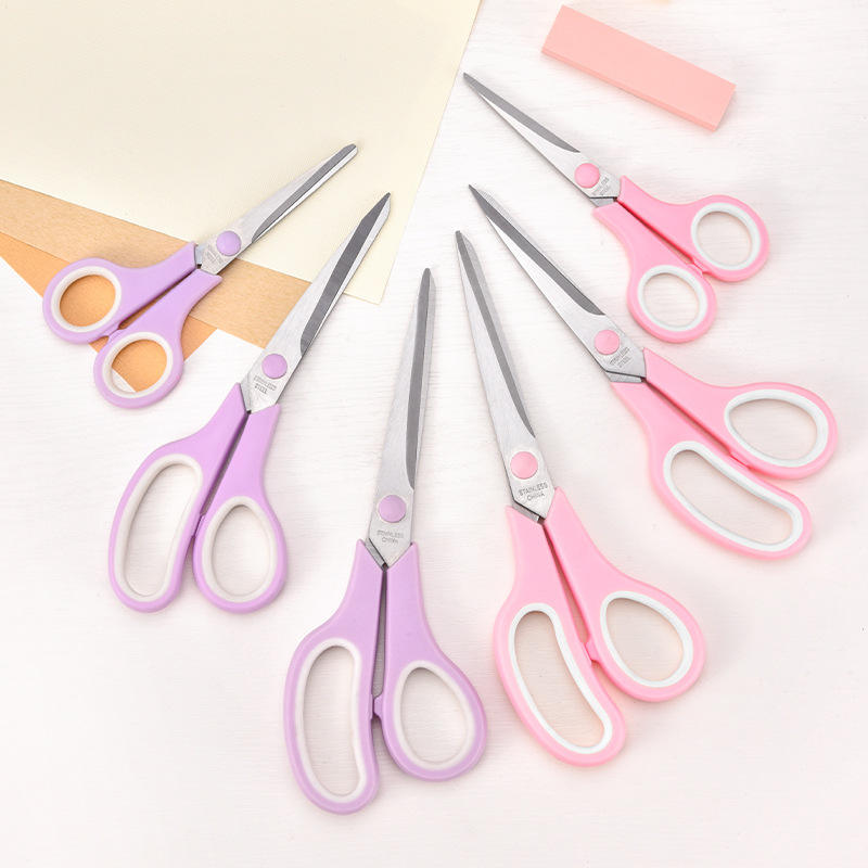 กรรไกรใช้ในบ้าน สแตนเลส สำหรับงานฝีมือ ใช้ในสำนักงาน สีม่วงชมพู ด้ามจับรูปตัววี สีมาการอง อุปกรณ์ศิลปะสำหรับนักเรียน