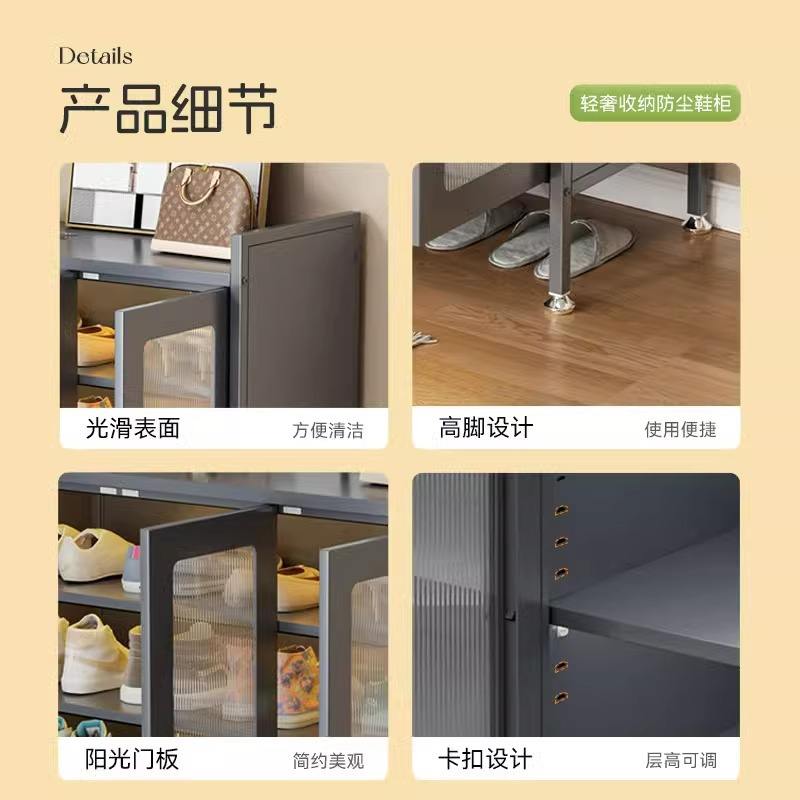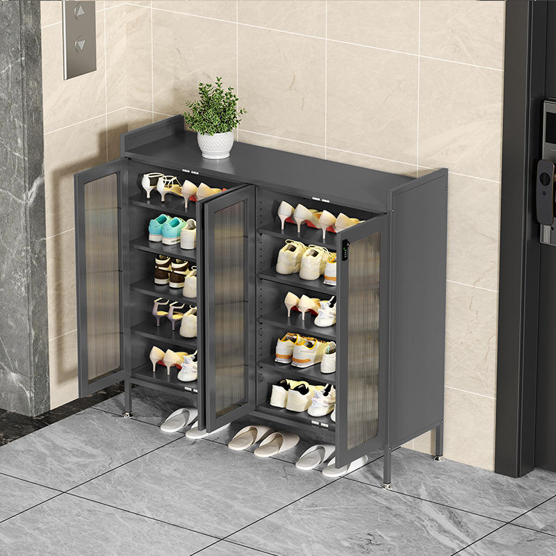 ตู้เก็บรองเท้าแบบหลายชั้นสำหรับใช้ภายในบ้าน ทำจากเหล็ก พร้อมบานกระจกและชั้นวางด้านบน