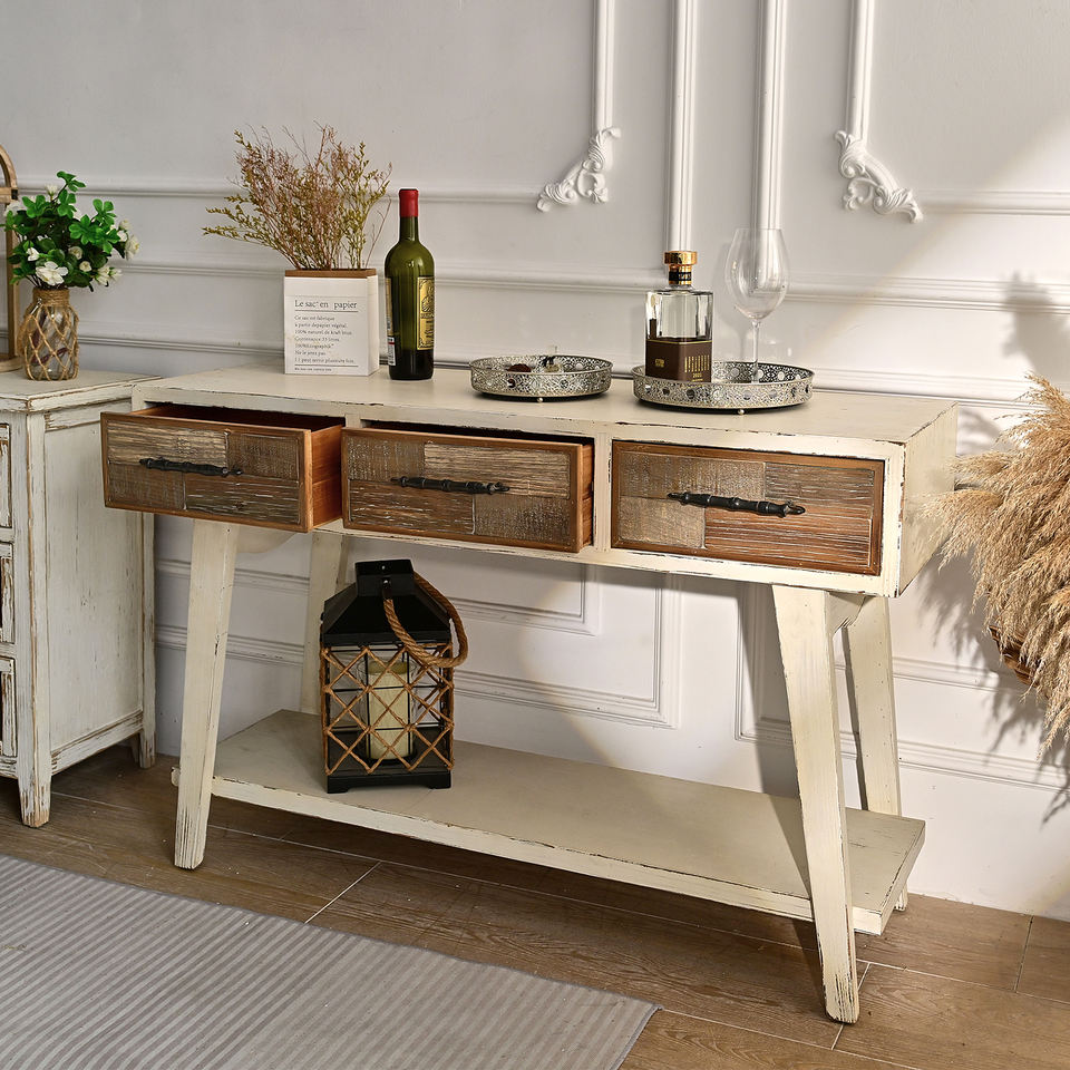 โต๊ะคอนโซลไม้เนื้อแข็ง 3 ลิ้นชัก สไตล์บ้านไร่แบบเรียบง่าย สำหรับห้องนั่งเล่น ห้องรับประทานอาหาร ทางเข้าบ้าน ดีไซน์โบราณ ทนทาน ใช้งานง่าย เหมาะสำหรับโรงแรม