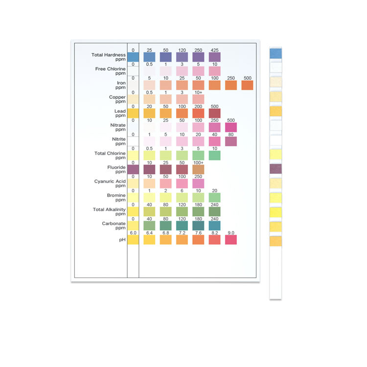 ความแข็ง, ไนเตรต, ไนไตรต์, เหล็ก, ทองแดง, คลอรีนอิสระ, ความเป็นด่าง, pH