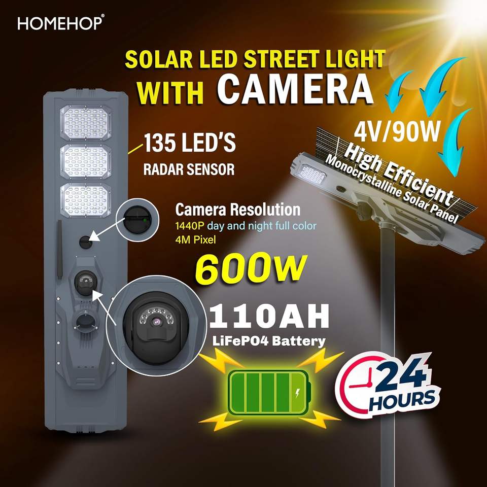 โฮมฮอป 600 วัตต์ไฟถนนพลังงานแสงอาทิตย์กลางแจ้งพร้อมกล้องรักษาความปลอดภัย, โคมไฟเซ็นเซอร์ตรวจจับความเคลื่อนไหว LED กันน้ำ 135 ดวงพร้อมรีโมท