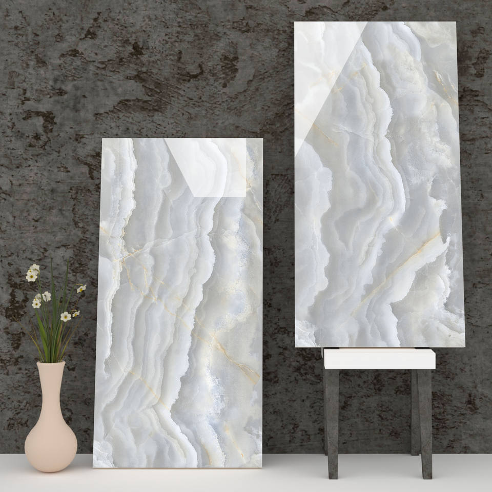 กระเบื้องปูพื้นพอร์ซเลนเคลือบเงา ความละเอียดสูง ขนาด 600x1200 มม. ผิวขัดเงา/ด้าน ผลิตในอินเดีย สำหรับห้องรับรองโรงแรม