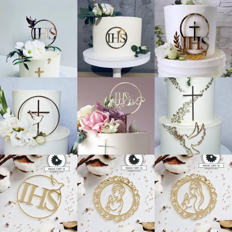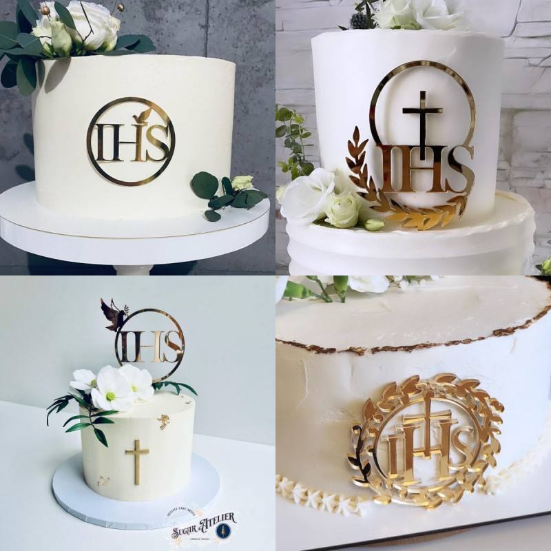 ของตกแต่งเค้กสำหรับพิธีศีลมหาสนิท รูปทรงกากบาท นกพิราบ และอักษร IHS ทำจากอะคริลิก สำหรับงานเลี้ยง