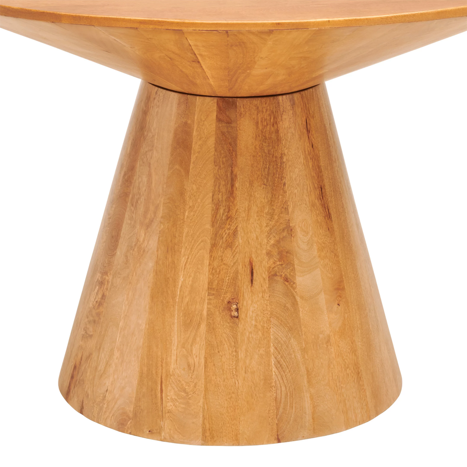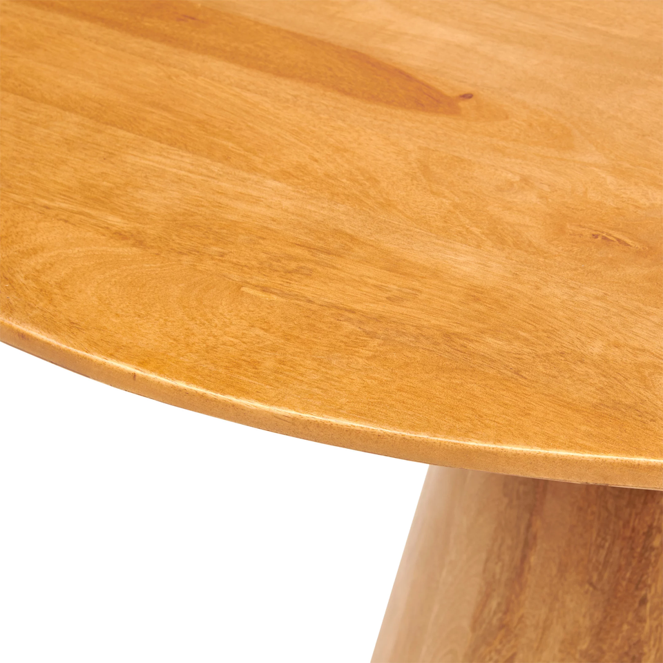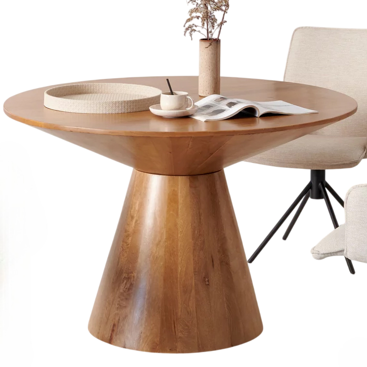 โต๊ะรับประทานอาหารทรงกลมไม้มะม่วงสีน้ำผึ้งสไตล์โมเดิร์นสำหรับตกแต่งบ้าน พร้อมฐานไม้ทรงสวยงาม