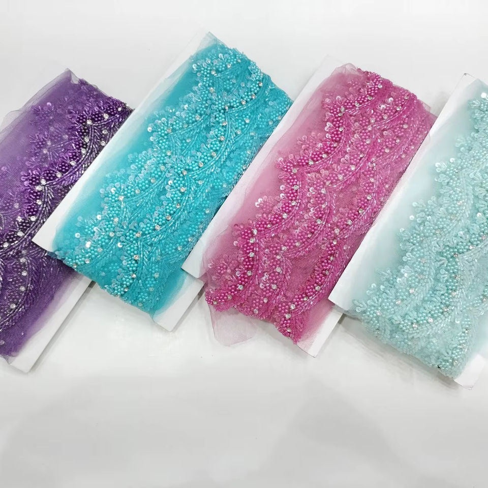 ผ้าลูกไม้เนื้อนุ่มหรูหรา เป็นมิตรกับสิ่งแวดล้อม ประดับด้วยลูกปัด พร้อมลายปักแบบฝรั่งเศส ลวดลายเรขาคณิต เหมาะสำหรับชีวิตประจำวัน