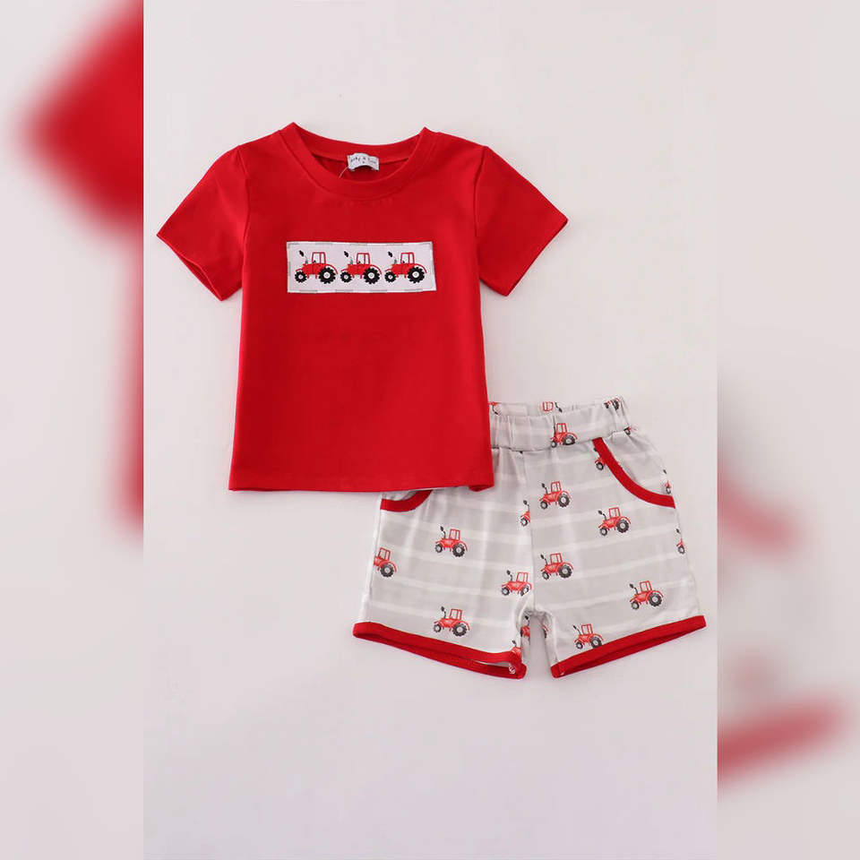 ชุดเสื้อผ้าเด็กผู้ชายลายรถแทรกเตอร์สีแดง ปักลาย ชุดลำลองสุดเท่ห์สำหรับฤดูร้อน ผ้าสแปนเด็กซ์/คอตตอน ลายเรียบ ใส่สบาย