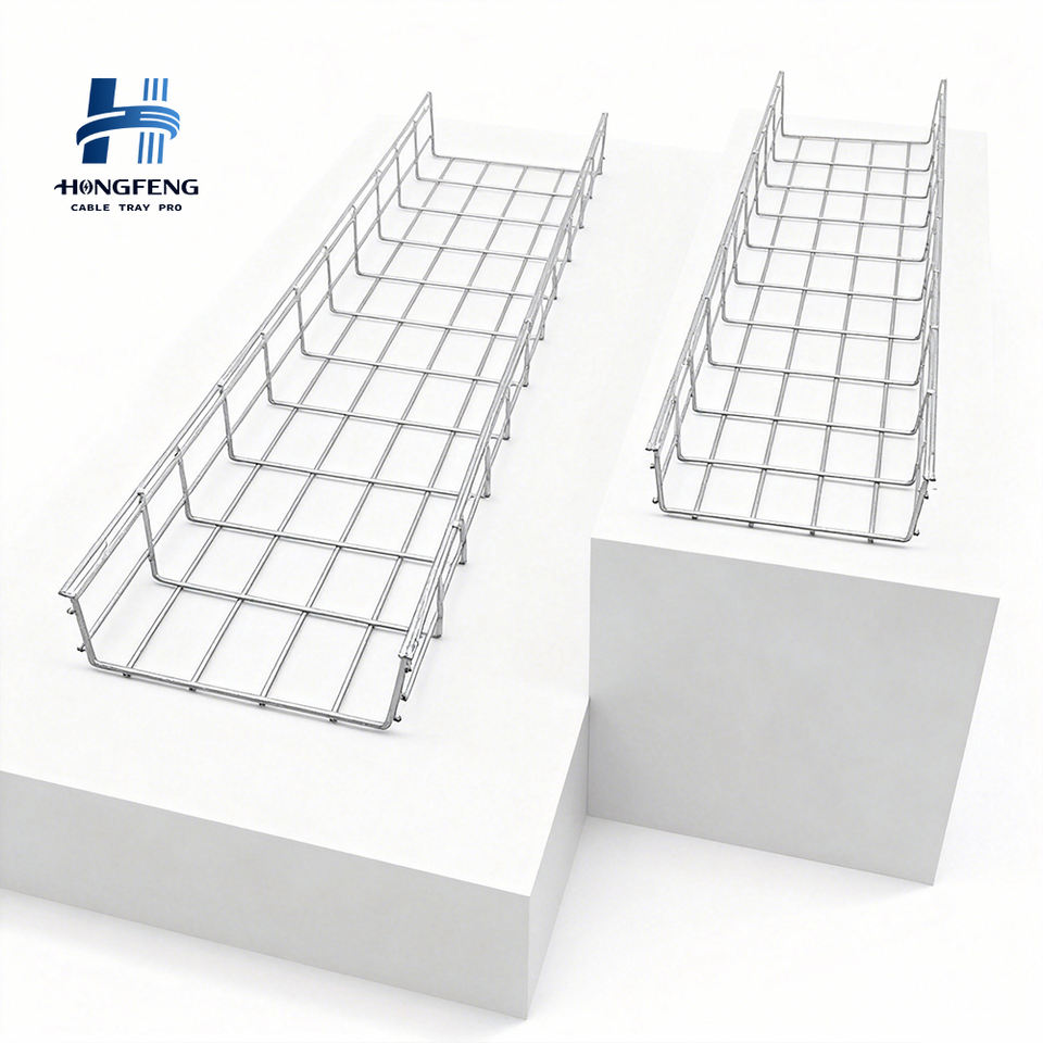 ถาดวางสายเคเบิลแบบตาข่ายลวดเหล็กกล้าไร้สนิมชุบสังกะสีแบบจุ่มร้อนของบริษัทหงเฟิง รับน้ำหนักได้ 200 กก. ความยาว 6 ม. กว้าง 150 มม. สีตามสั่ง