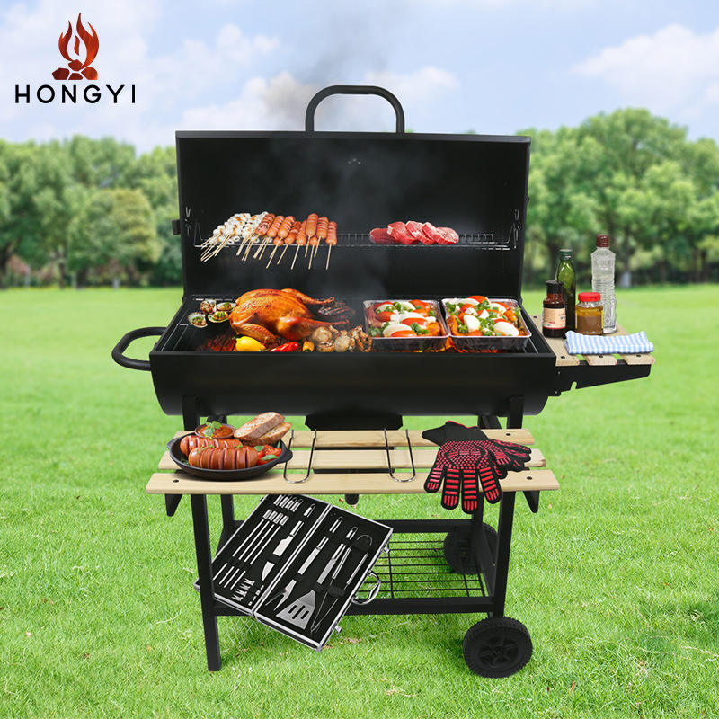 เตาบาร์บีคิวไร้ควัน Hongyi รุ่น Bq205387b สำหรับใช้งานกลางแจ้ง พร้อมชั้นวางไม้และล้อ สำหรับปิกนิกและงานปาร์ตี้