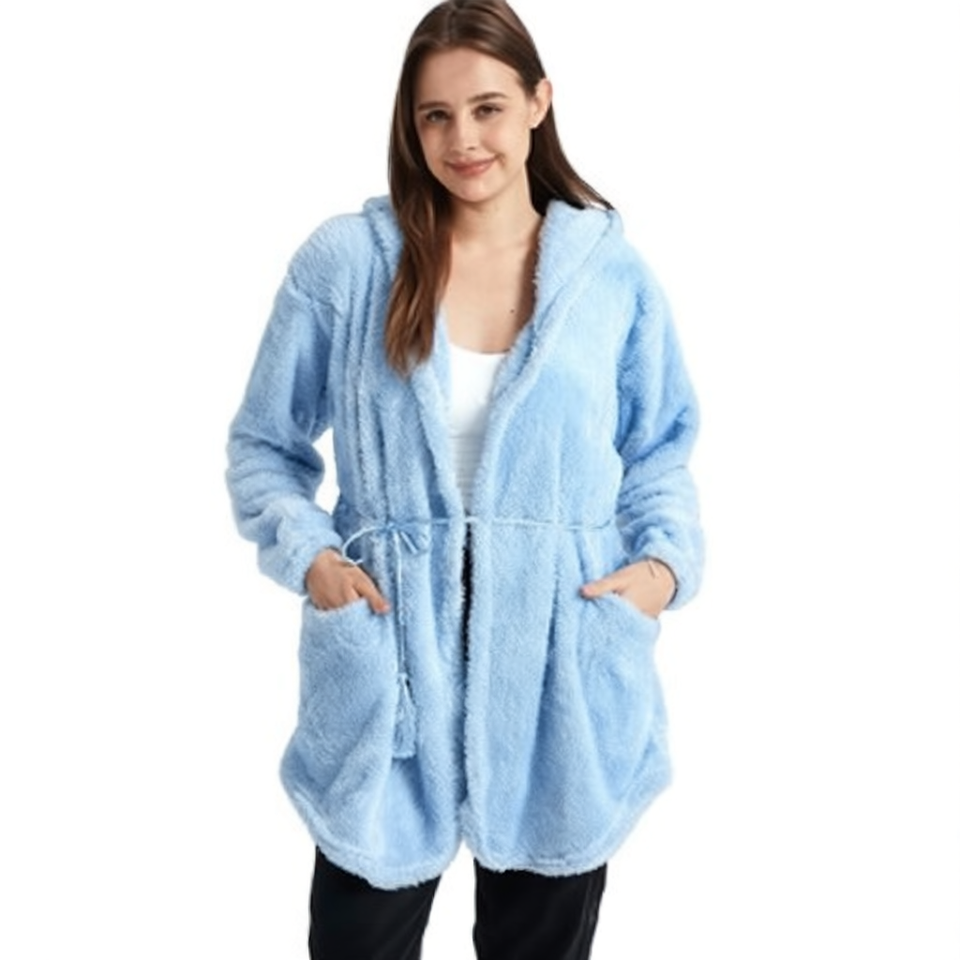 เสื้อโค้ทขนสัตว์เทียมมีฮู้ด แขนยาว มีเข็มขัด กระเป๋าเสื้อ สำหรับฤดูหนาว สไตล์ลำลอง เสื้อคลุมผู้หญิง ผ้าฟลีซหนานุ่ม ถักทอสีพื้น แขนยาวเต็มตัว