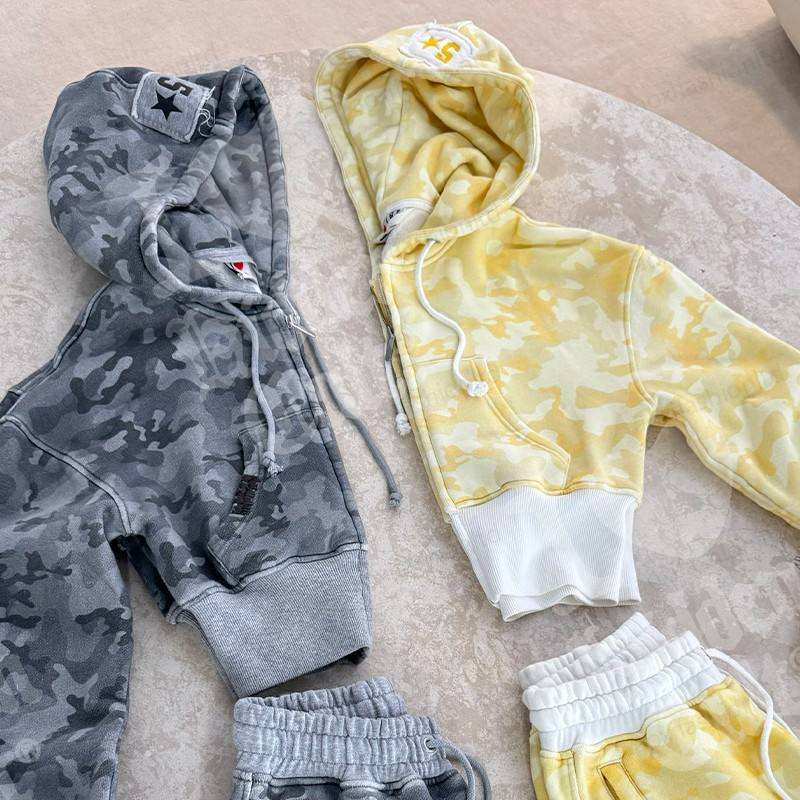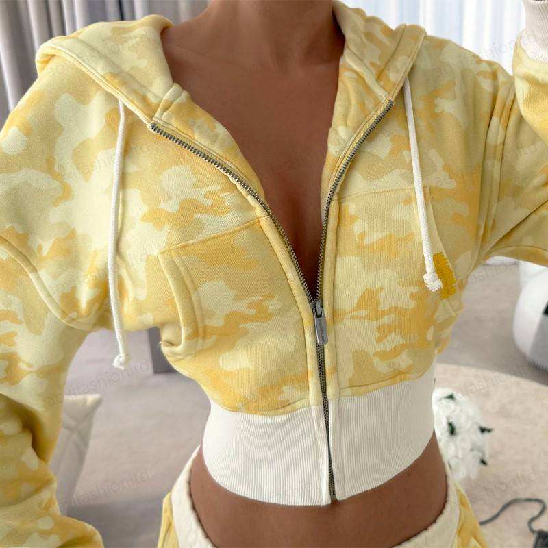 ชุดเซ็ทฮู้ดดี้ 2 ชิ้น เสื้อผ้ากีฬาผู้หญิง ซิปแบบรูดขึ้น ชุดฮู้ดดี้ครอปปักลายตัวอักษร ลายพราง ไซส์พลัส ชุดวอร์ม โลโก้สั่งทำได้
