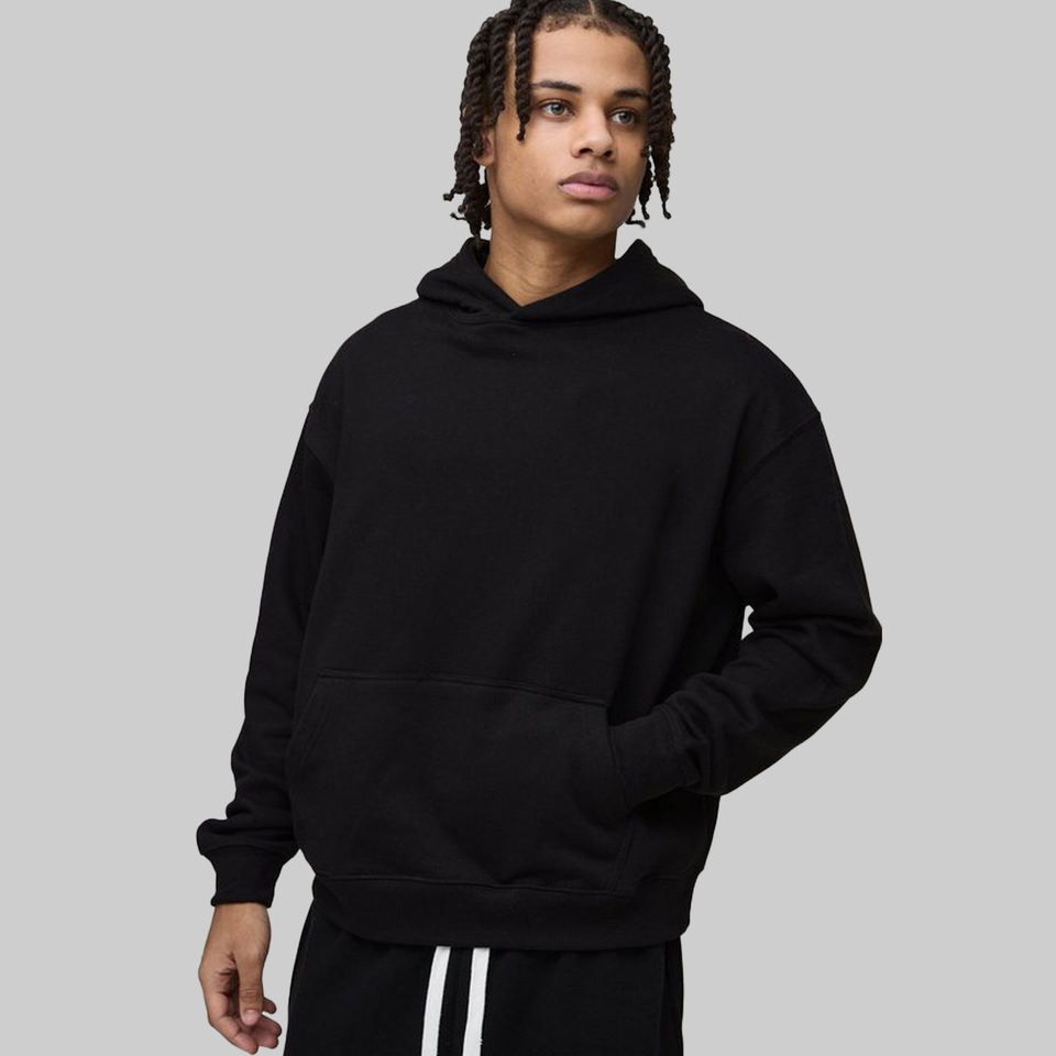 เสื้อฮู้ดดี้และเสื้อสเวตเชิ้ตผ้าฝ้ายเฟรนช์เทอร์รี่ 100% แบบหนา พิมพ์โลโก้ได้ตามต้องการ ทรงโอเวอร์ไซส์ ไหล่ตก ทรงบ็อกซี่ สำหรับผู้ชาย