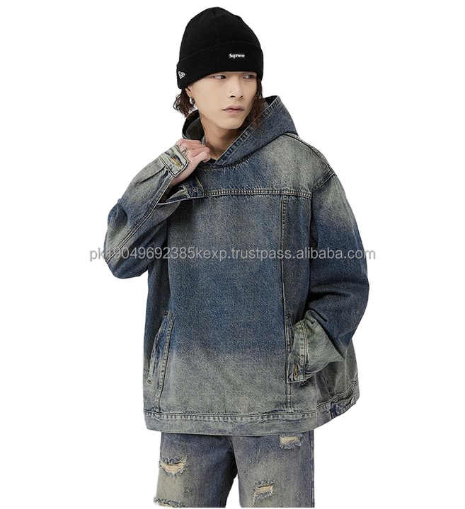 เสื้อฮู้ดดี้เดนิมฟอกทำให้ดูเก่า สไตล์หลวม เสื้อโค้ทผู้ชาย แฟชั่นเทรนด์ สตรีทสไตล์